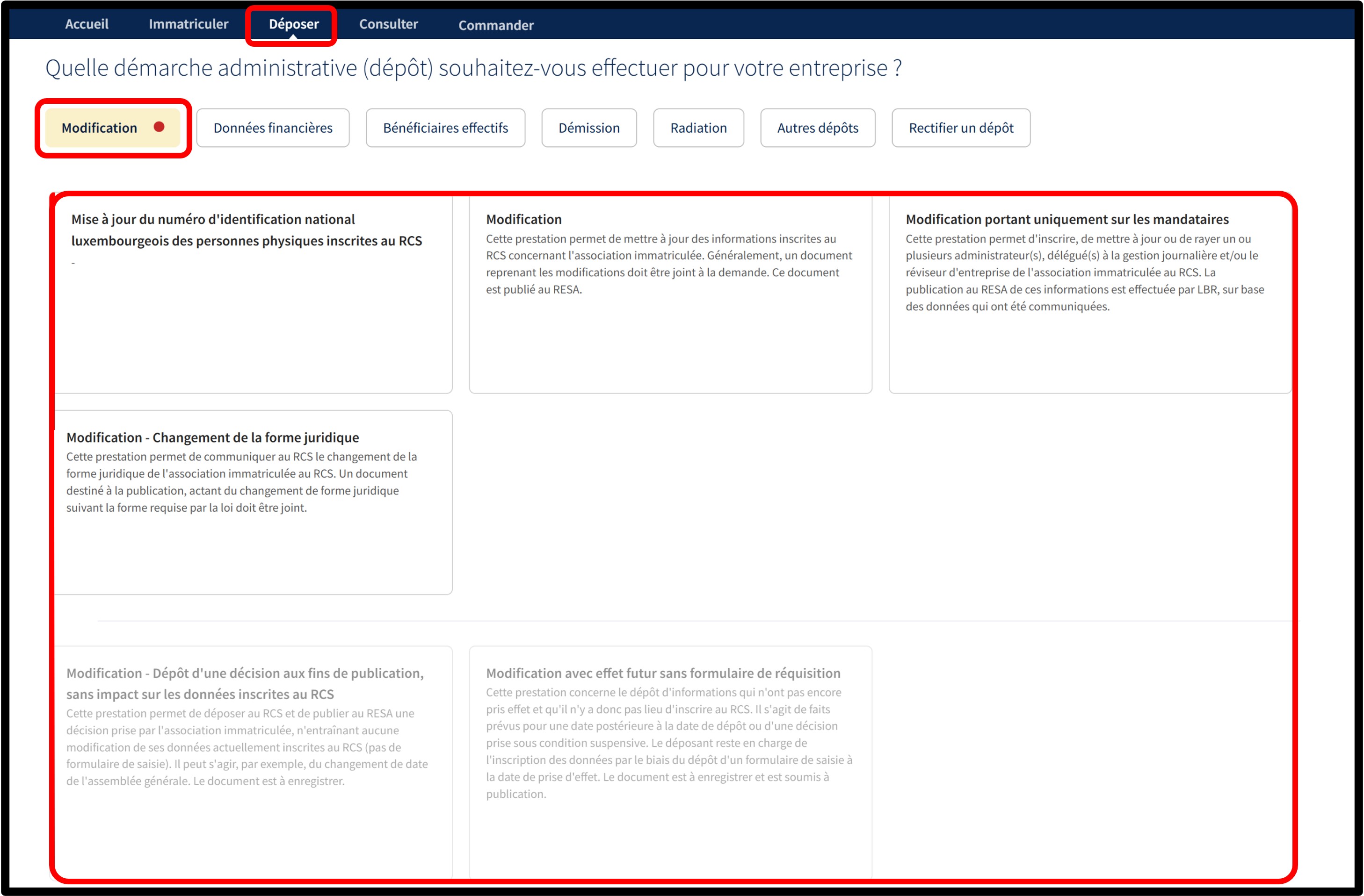 3) Sélectionner au sein des démarches administratives disponibles la catégorie Modification.