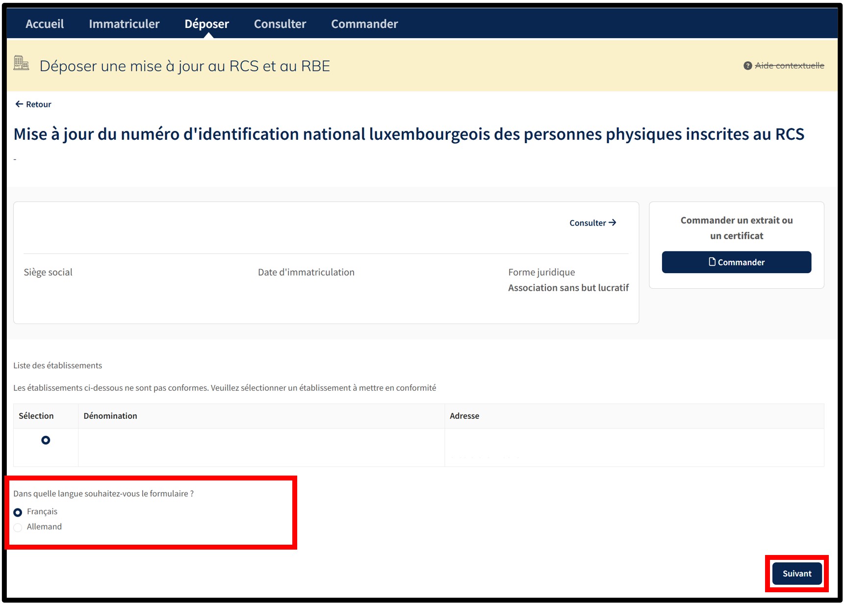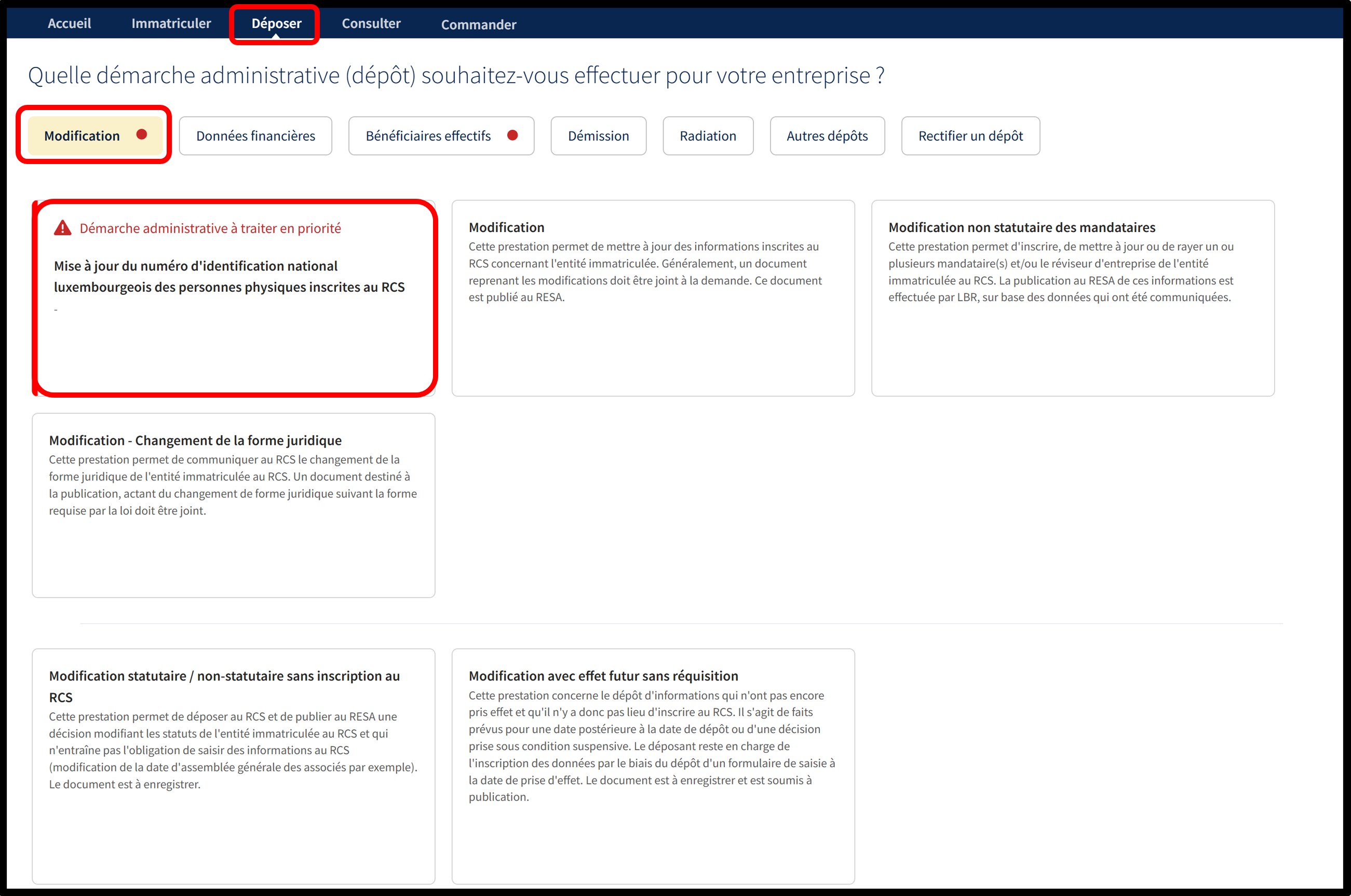 Cette prestation permet la mise à jour du numéro d'identification national luxembourgeois des administrateurs et/ou délégué(s) à la gestion journalière de l'ASBL. Ce numéro doit être renseigné pour toute personne physique inscrite ou à inscrire au RCS, au sein du dossier de votre ASBL, à quelque titre que ce soit.