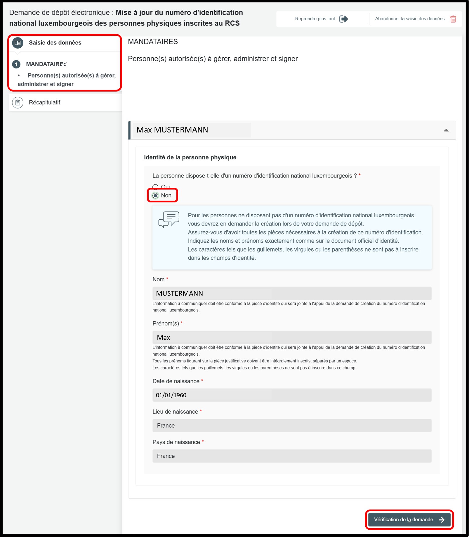 Concernant les personnes physiques à inscrire au RCS, si l'administrateur et/ou le délégué à la gestion journalière ne dispose pas d’un numéro d’identification national luxembourgeois, la création de ce dernier doit être demandée dans le cadre de la demande de mise à jour. Pour ce faire, l'utilisateur doit cocher la case Non en réponse à la question posée au sein du formulaire de saisi, puis cliquer sur le bouton Saisir les mandataires ou Vérification de la demande pour accèder à la rubrique du formulaire de saisie permettant la création du numéro d'identification luxembourgeois.
