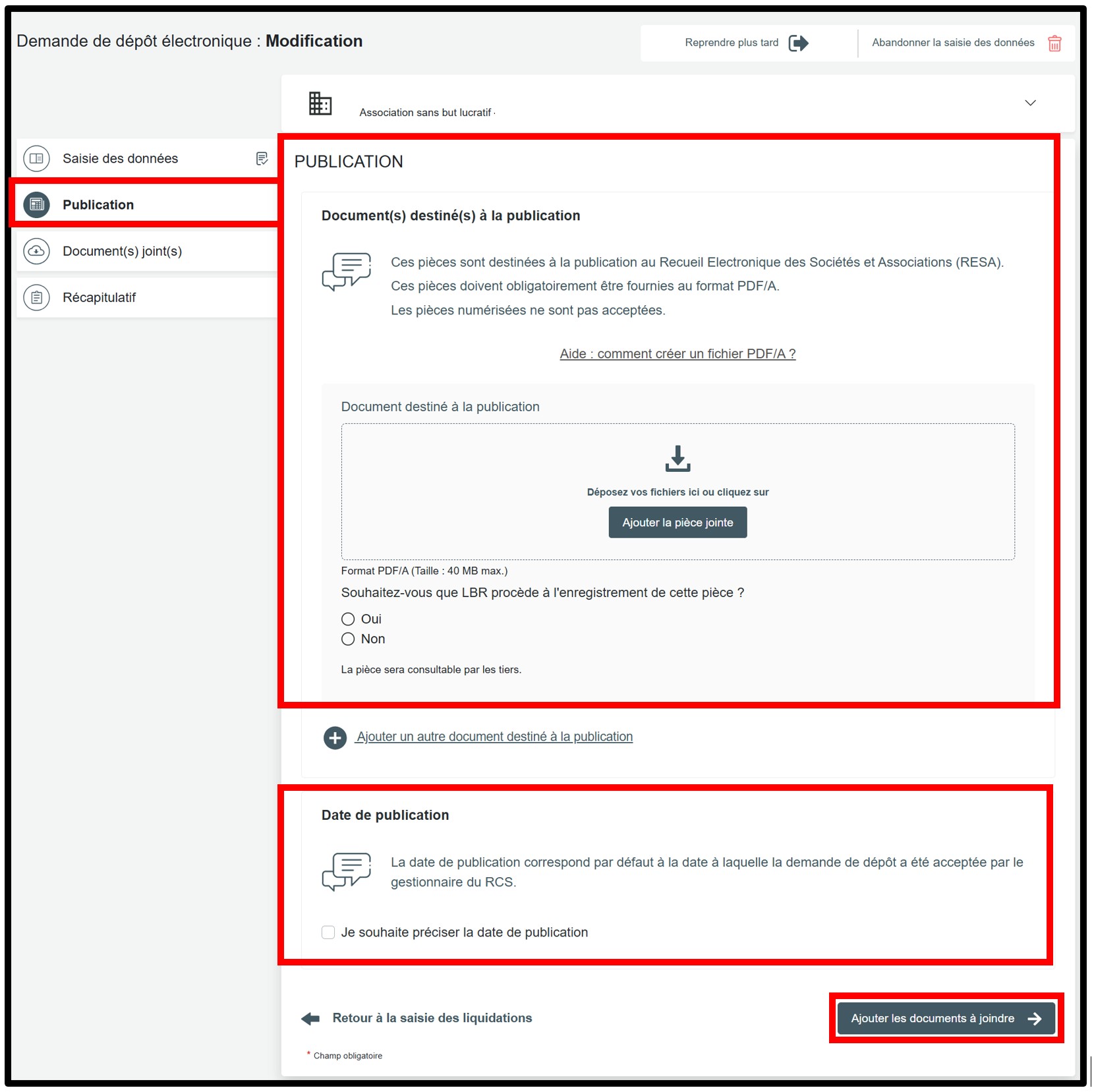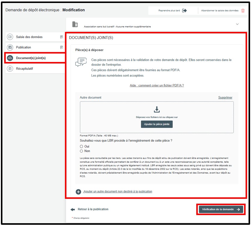 L'utilisateur est également invité à répondre à la question relative à l’enregistrement du document par LBR. Le gestionnaire du RCS est habilité à enregistrer les documents transmis à des fins de publication. L’utilisateur a dès lors le choix d’indiquer lors de sa demande s’il souhaite ou non que LBR procède à l’enregistrement de la pièce en question. Pour ce faire, l’utilisateur est invité à cocher l’une des options disponibles. Si l'utilisateur coche Non, il devra faire enregistrer son document directement auprès de l'AED.