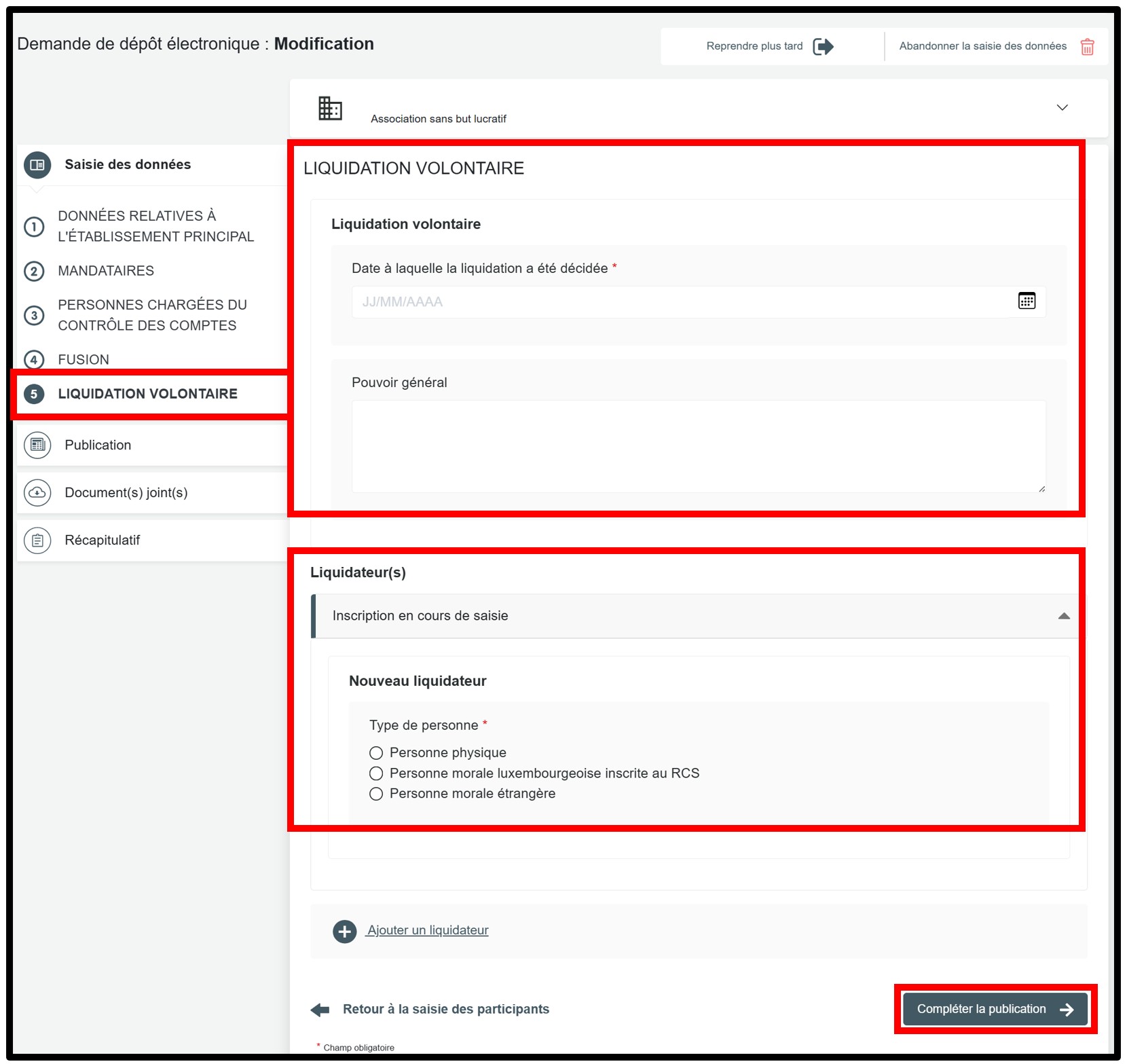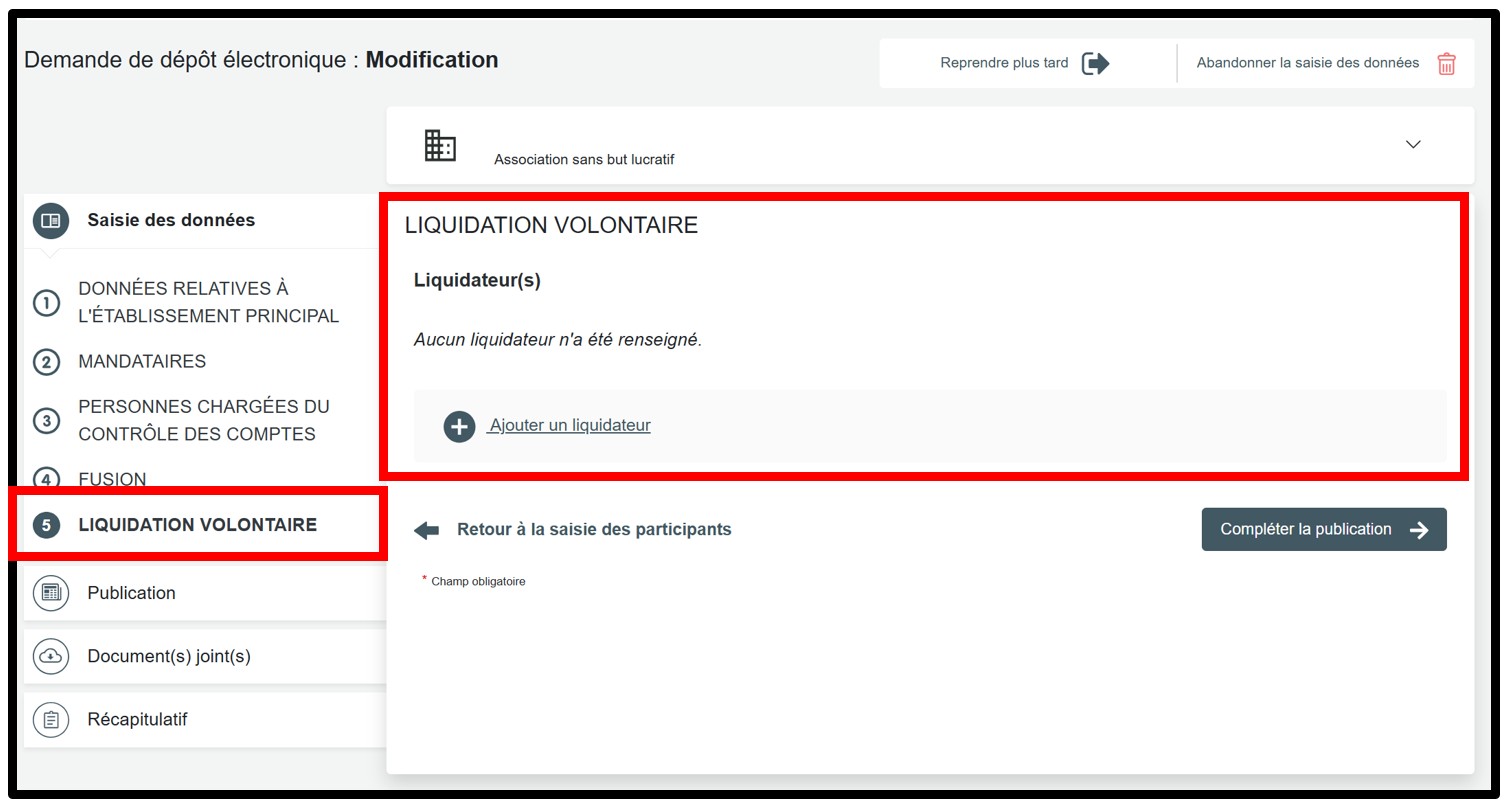 Lorsque les données requises ont été renseignées, l'utilisateur poursuit sa demande de liquidation volontaire en cliquant sur la bouton Compléter la publication.