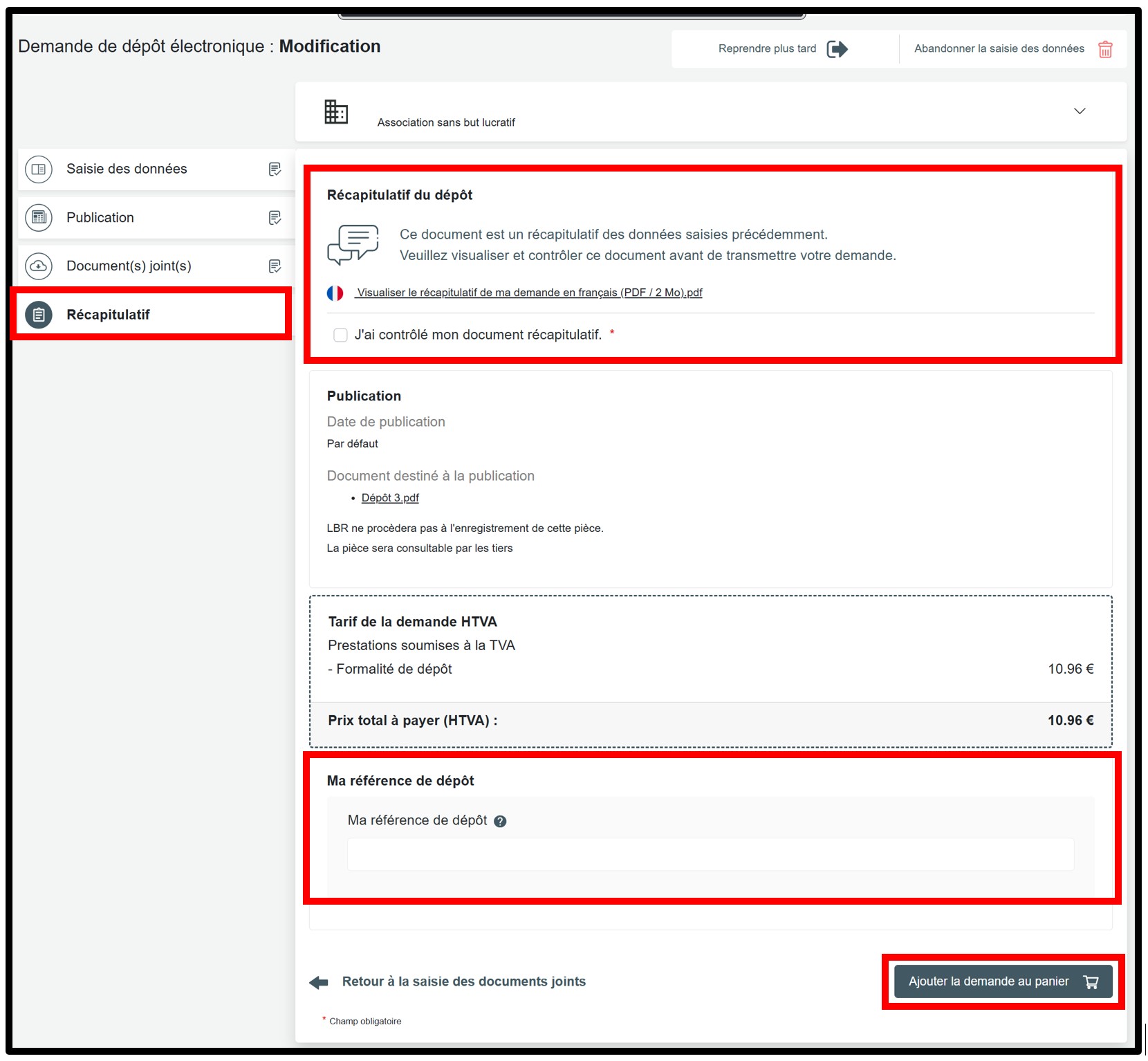 Si lors de cette étape de vérification du document récapitulatif, l’utilisateur constate que les informations saisies sont correctes, il doit obligatoirement cocher la case J’ai contrôlé mon document récapitulatif. L’utilisateur peut également indiquer une référence de dépôt dans le champ Ma référence de dépôt, définie librement, pour mieux organiser ses demandes.