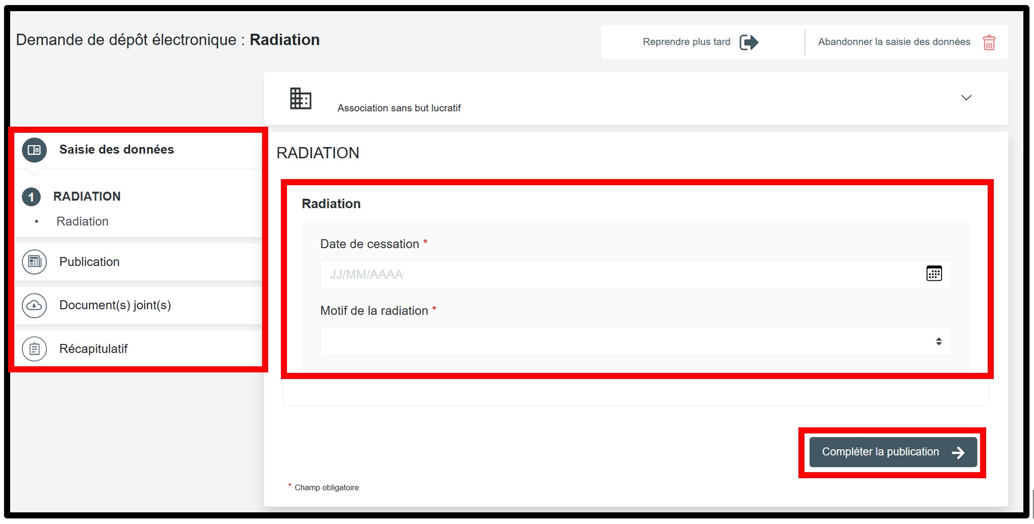 Une fois les données obligatoires saisies, l'utilisateur poursuit sa demande de radiation en cliquant sur la bouton Compléter la publication.