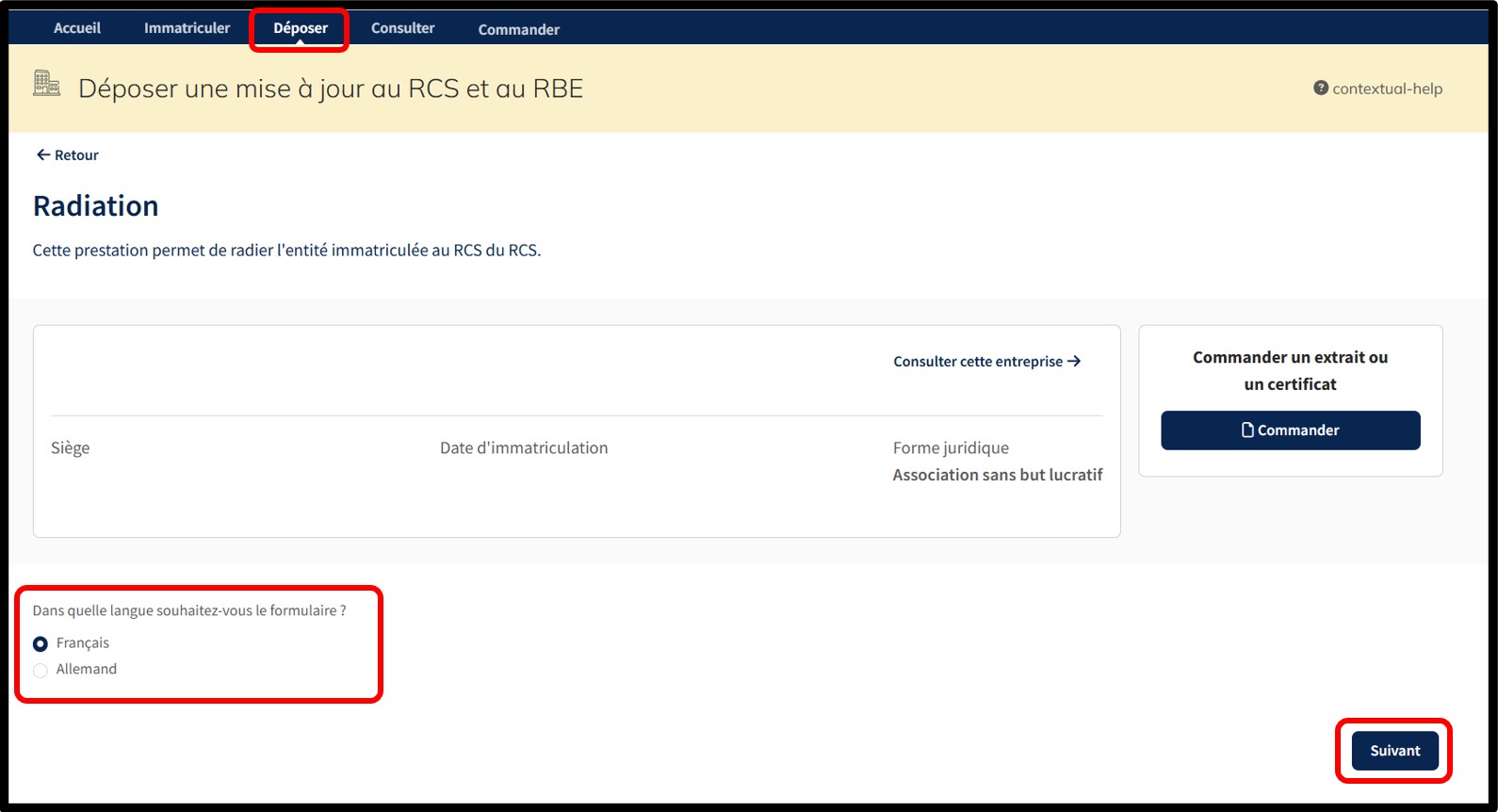 Après sélection de la prestation Radiation, l'utilisateur est invité à choisir la langue du formulaire de saisie relatif à la demande de dépôt de radiation. Après indication de son choix, l’utilisateur valide la création de sa demande de dépôt de radiation en cliquant sur le bouton Suivant. L’utilisateur est ensuite redirigé vers le formulaire de saisie correspondant à la démarche choisie.