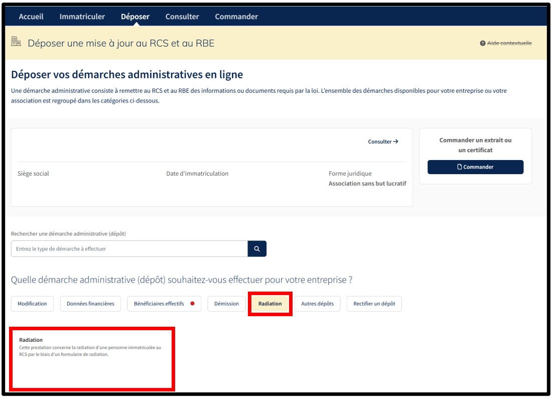 3) Sélectionner au sein des démarches administratives disponibles la catégorie Radiation.