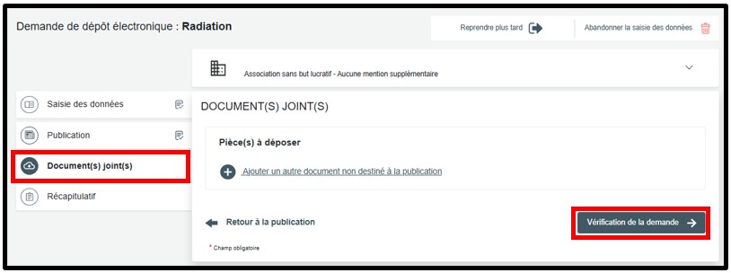 Pour continuer sa demande de dépôt, l'utilisateur doit ensuite cliquer sur le bouton Vérification de la demande.
