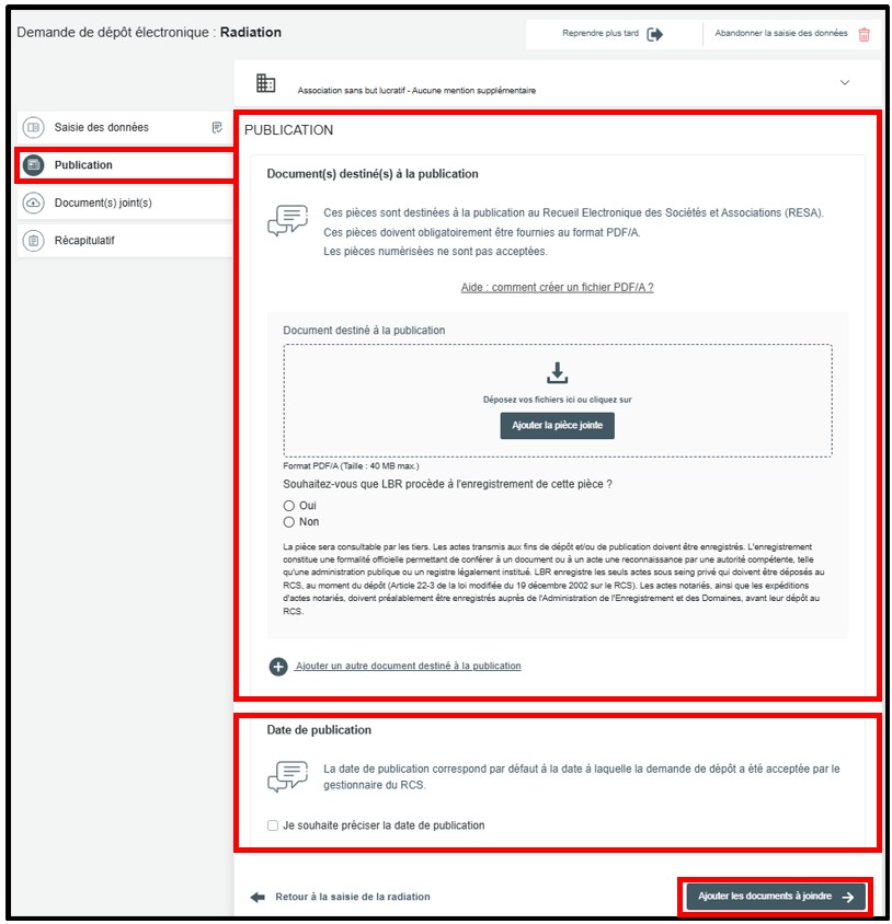 L'utilisateur est également invité à répondre à la question relative à l’enregistrement du document par LBR. Le gestionnaire du RCS est habilité à enregistrer les documents transmis à des fins de publication. L’utilisateur a dès lors le choix d’indiquer lors de sa demande s’il souhaite ou non que LBR procède à l’enregistrement de la pièce en question. Pour ce faire, l’utilisateur est invité à cocher l’une des options disponibles. Si l'utilisateur coche Non, il devra faire enregistrer son document directement auprès de l'AED.