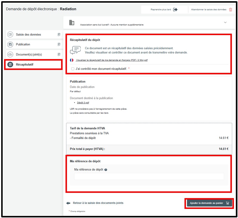 Si lors de cette étape de vérification du document récapitulatif, l’utilisateur constate que les informations saisies sont correctes, il doit obligatoirement cocher la case J’ai contrôlé mon document récapitulatif. L’utilisateur peut également indiquer une référence de dépôt dans le champ Ma référence de dépôt, définie librement, pour mieux organiser ses demandes.