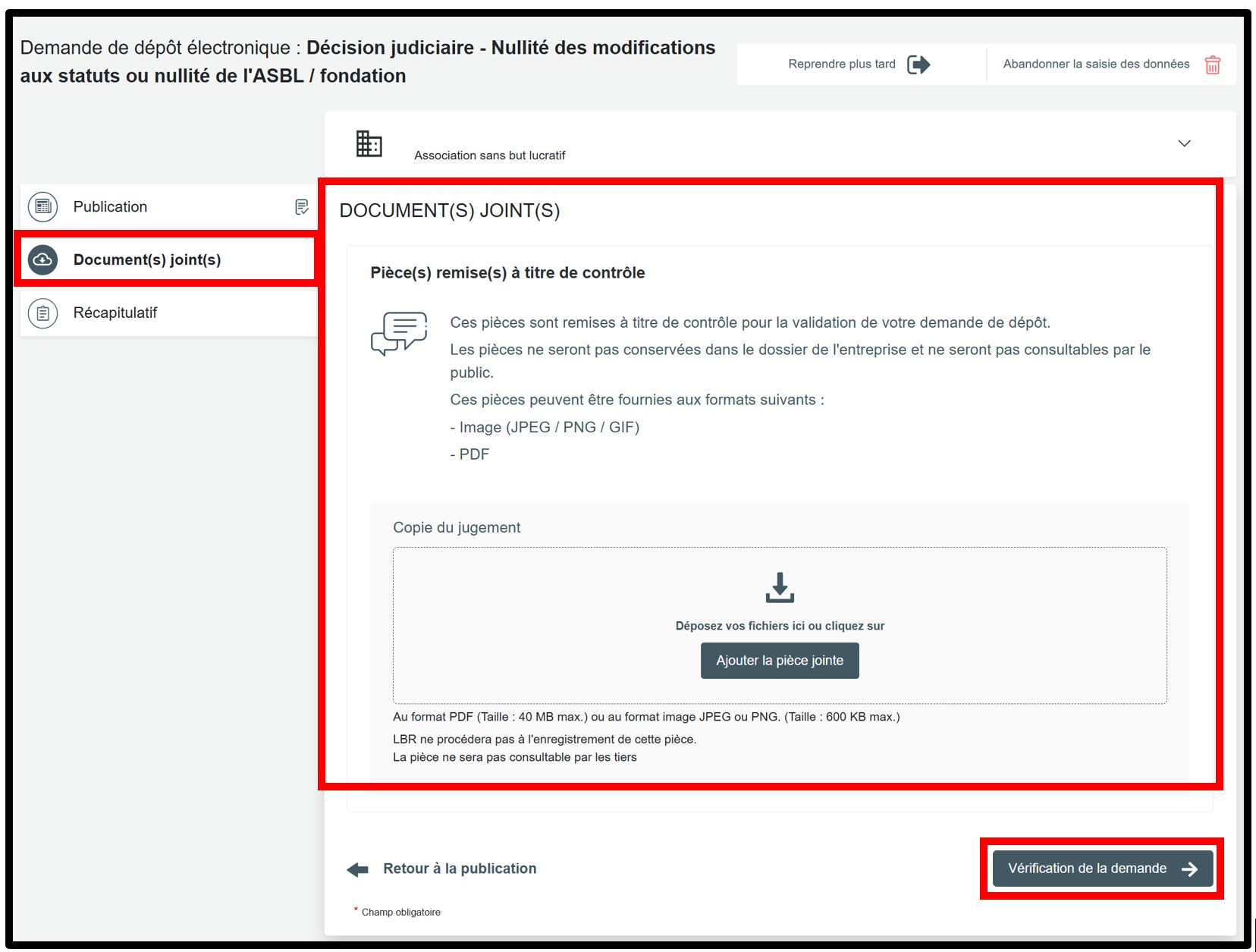 Au sein de la rubrique Document(s) joint(s), l’utilisateur doit télécharger une copie du jugement au format PDF ou JPEG, au sein du champ Pièce(s) remise(s) à titre de contrôle en cliquant sur le bouton Ajouter la pièce jointe. Ce document étant requis à des fins de contrôle pour la validation de la demande de dépôt. Pour continuer sa demande de dépôt, l'utilisateur doit ensuite cliquer sur le bouton Vérification de la demande.