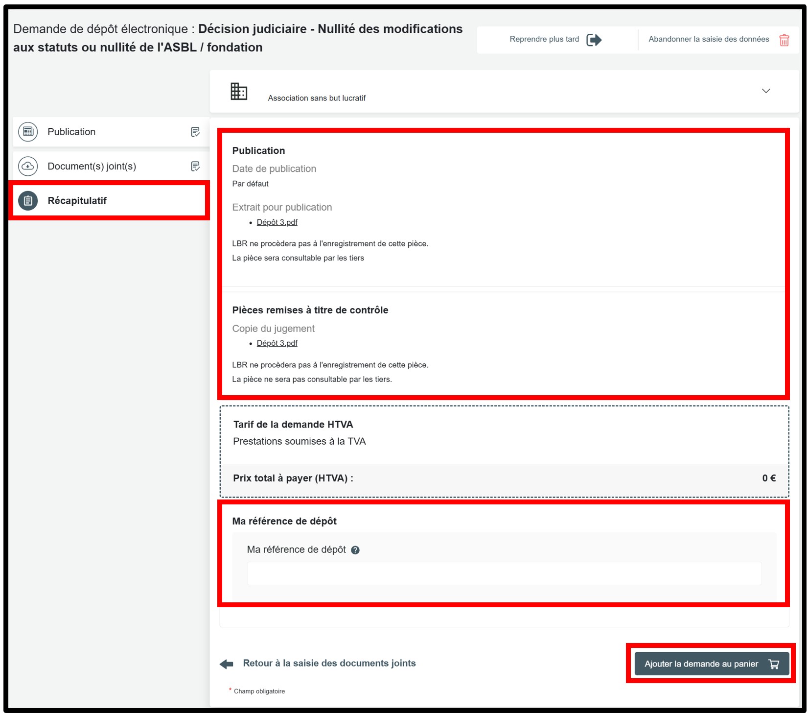 La rubrique Récapitulatif reprend le récapitulatif de la demande à des fins de vérification par l’utilisateur avant que celle-ci soit transmise au panier. L’utilisateur peut également indiquer une référence de dépôt dans le champ Ma référence de dépôt, définie librement, pour mieux organiser ses demandes. L'utilisateur valide ensuite sa demande de démarche administrative en cliquant sur le bouton Ajouter la demande au panier.