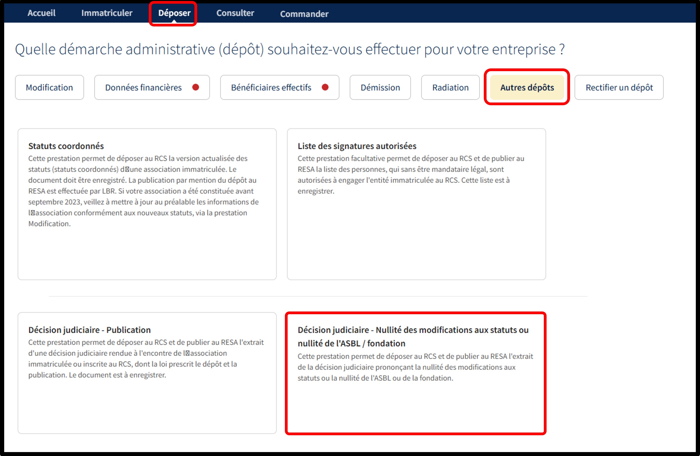 Cette prestation permet de déposer au RCS l’extrait de la décision judiciaire prononçant la nullité des modifications aux statuts ou la nullité de l'ASBL ou de la fondation. Le document est à enregistrer et est soumis à publication au RESA.