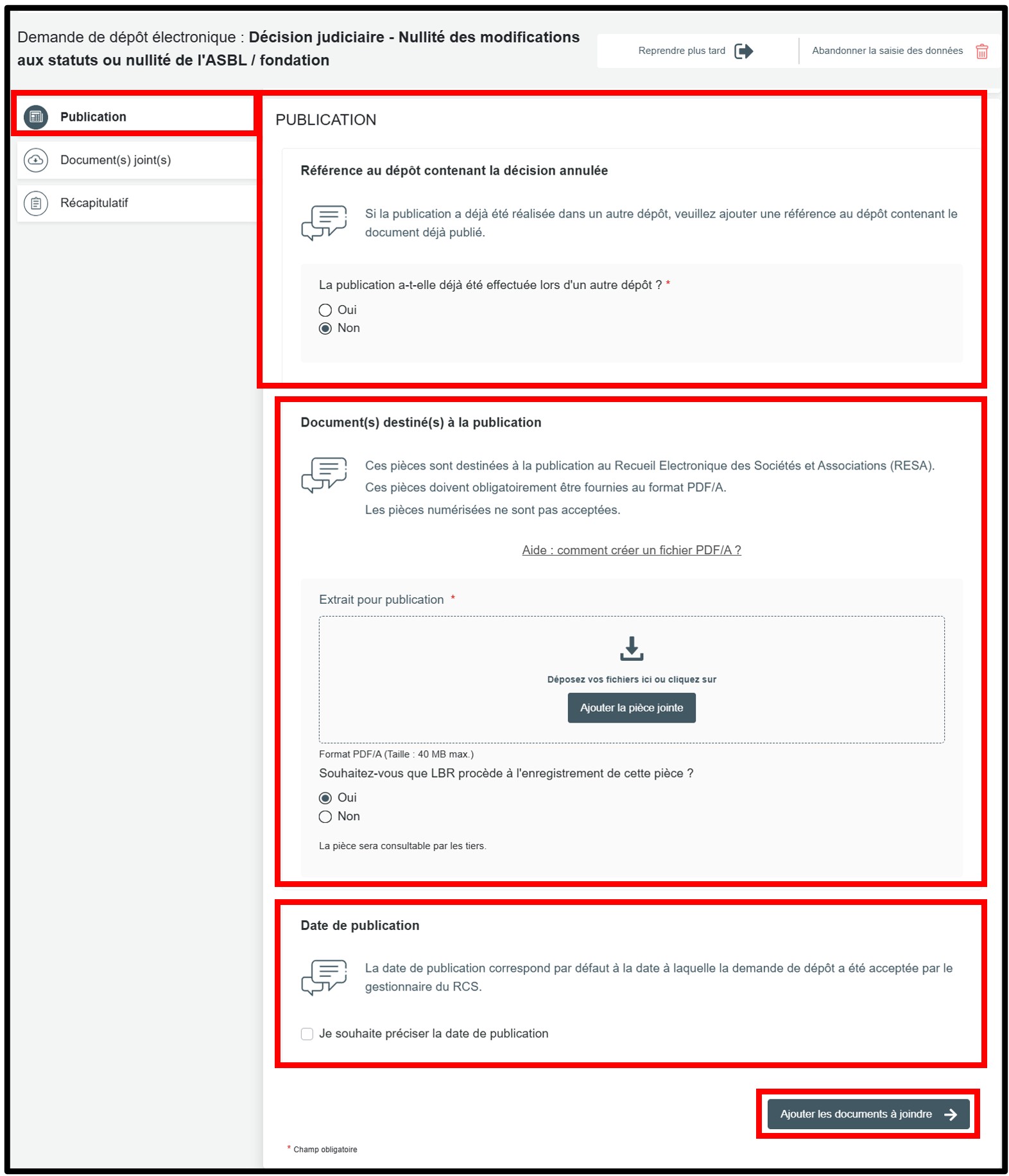 - En cochant la case Non, l'utilisteur doit joindre l'extrait de la décision judiciaire, au format PDF/A, au sein du champ Document(s) destiné(s) à la publication en cliquant sur le bouton Ajouter la pièce jointe.
