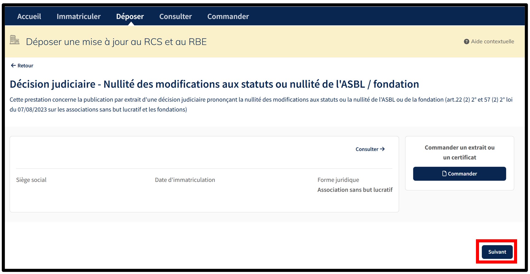 Après avoir sélectionné la prestation Décision judiciaire - Nullité des modification aux statuts ou nullité de l'ASBL / fondation, l'utilisateur doit valider la création de sa demande de dépôt en cliquant sur le bouton Suivant. L'utilisateur est ensuite redirigé vers le formulaire correspondant à la démarche choisie.