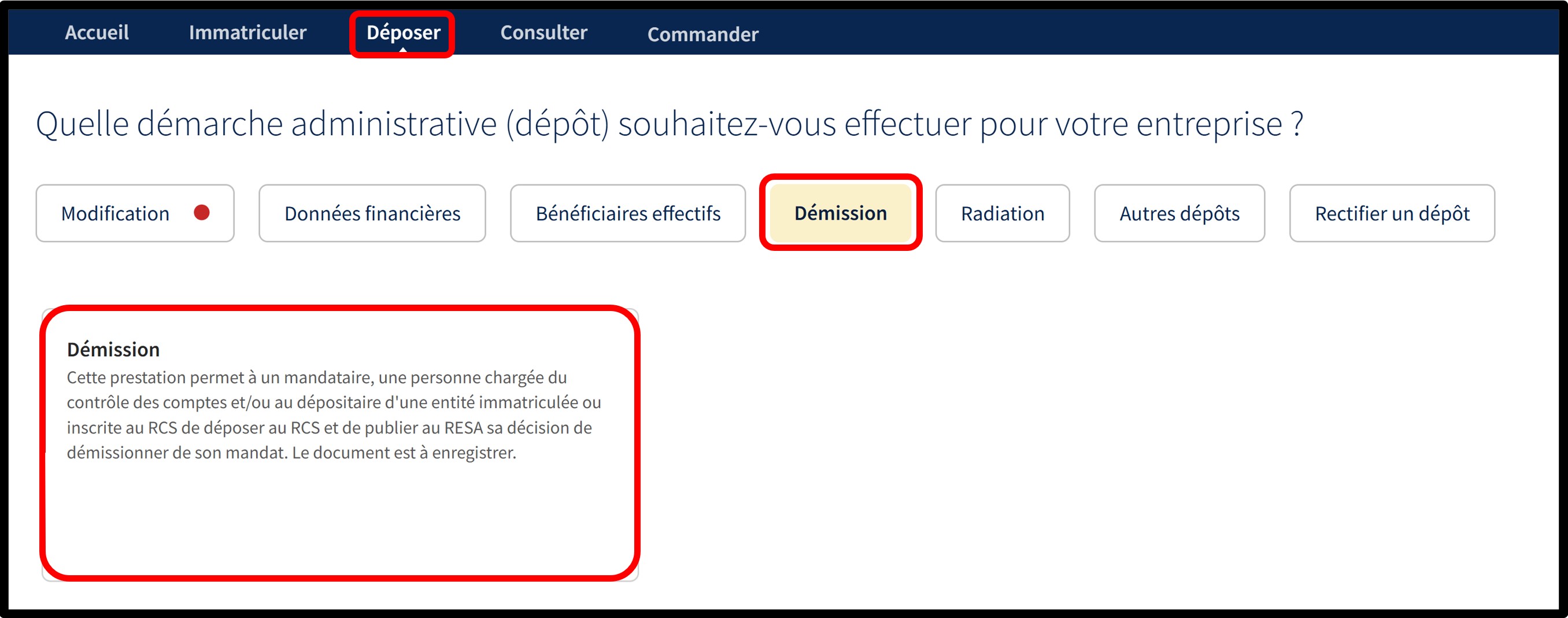 Cette prestation permet d'inscrire au RCS la démission d'un administrateur et/ou délégué à la gestion journalière de votre association. Pour effectuer ce dépôt, l'ASBL doit utiliser la démarche Démission. Une fois la demande validée, la publication au RESA de ces informations est effectuée automatiquement par LBR, sur base des données qui ont été communiquées.