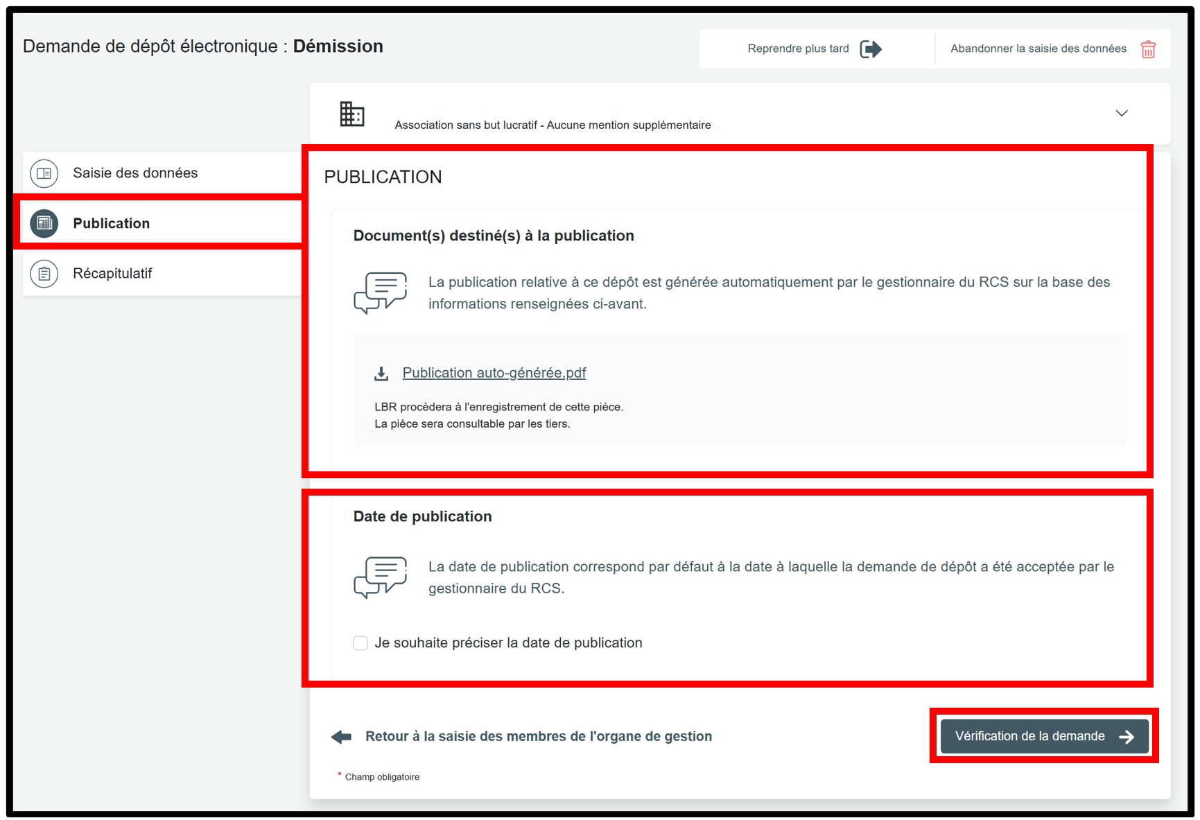 Dans le formulaire, au sein de la rubrique Publication, la publication relative à ce type de dépôt est générée automatiquement par le gestionnaire du RCS sur la base des informations renseignées dans la demande. Une fois la publication générée, l’utilisateur peut consulter le PDF de la publication auto-générée en cliquant sur le lien et vérifier l’exactitude des informations renseignées. En cas d’erreurs constatées, l’utilisateur a la possibilité de retourner à la demande pour apporter les corrections nécessaires.