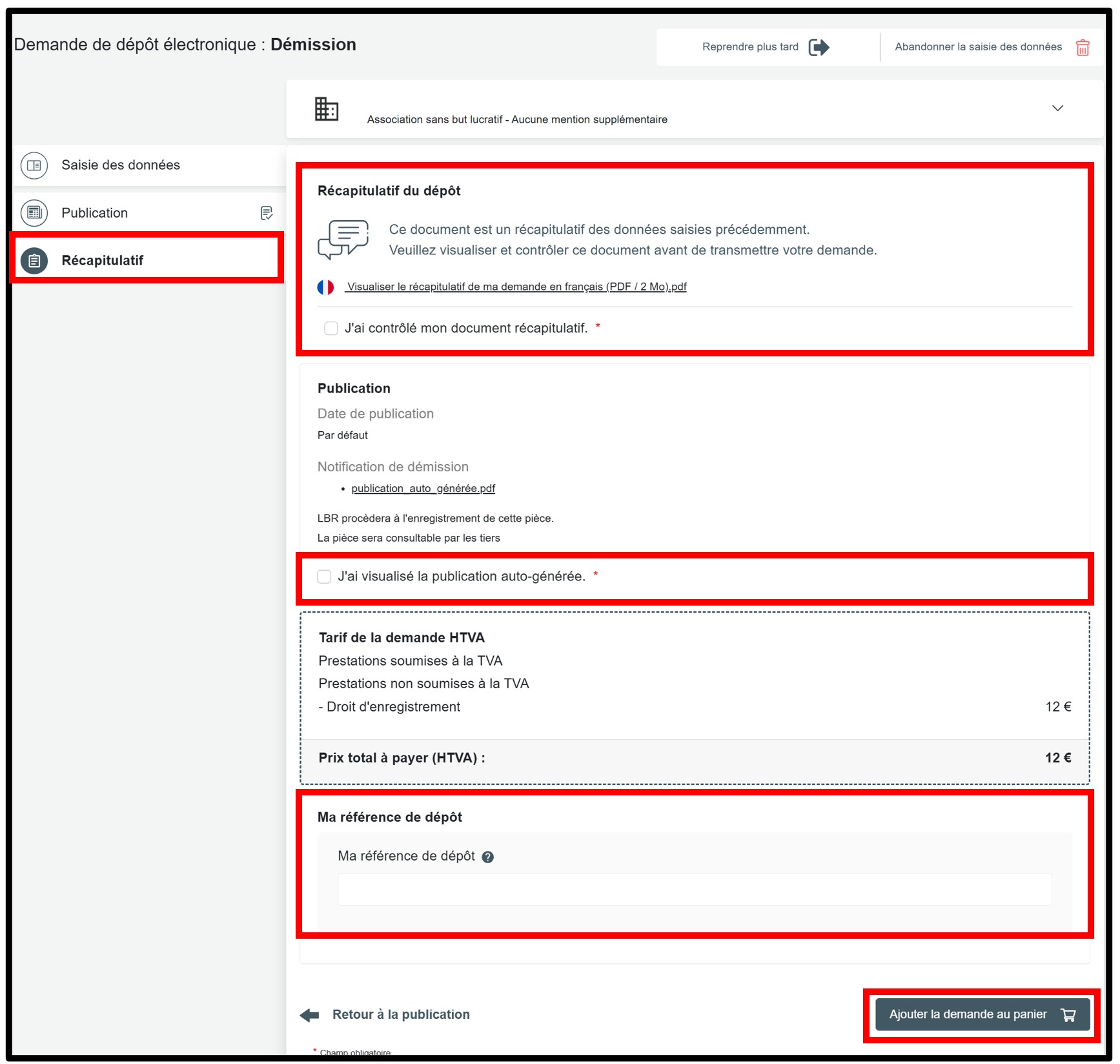 Si lors de cette étape de vérification du document récapitulatif, l’utilisateur constate que les informations saisies sont correctes, il doit obligatoirement cocher la case J’ai contrôlé mon document récapitulatif ainsi que la case J'ai visualisé la publication auto-générée. L’utilisateur peut également indiquer une référence de dépôt dans le champ Ma référence de dépôt, définie librement, pour mieux organiser ses demandes.