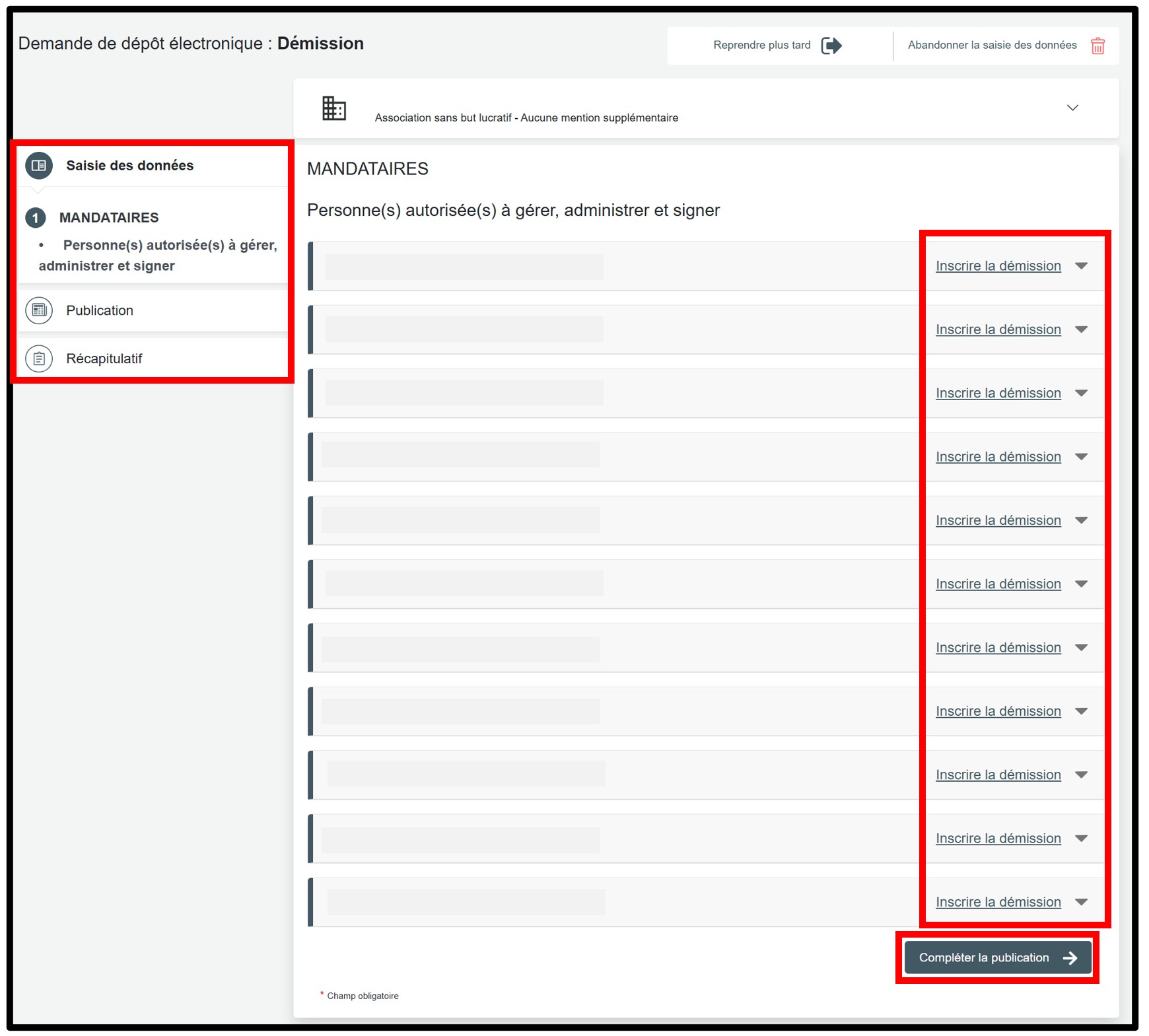 Au sein de la rubrique Mandataires, l'utilisateur est invité à inscrire la démission en cliquant sur l'option Inscrire une démission uniquement pour les mandataires concernés. L'utilisateur peut annuler l'inscription de la démission en cliquant sur l'option Annuler. Une fois les démissions inscrites, l'utilisateur valide son/ses choix en cliquant sur la bouton Compléter la publication.