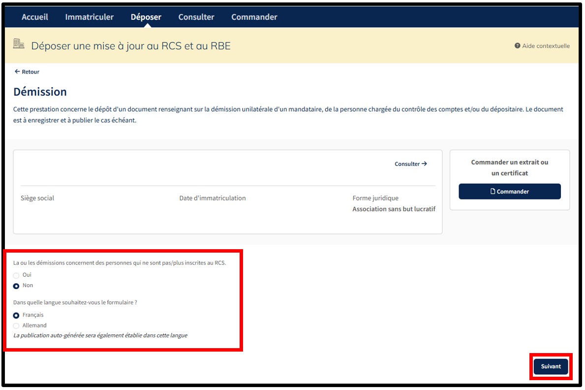 Après indication de ses choix, l’utilisateur valide la création de sa demande de dépôt de démission en cliquant sur le bouton Suivant. L’utilisateur est ensuite redirigé vers le formulaire de saisie correspondant à la démarche choisie.