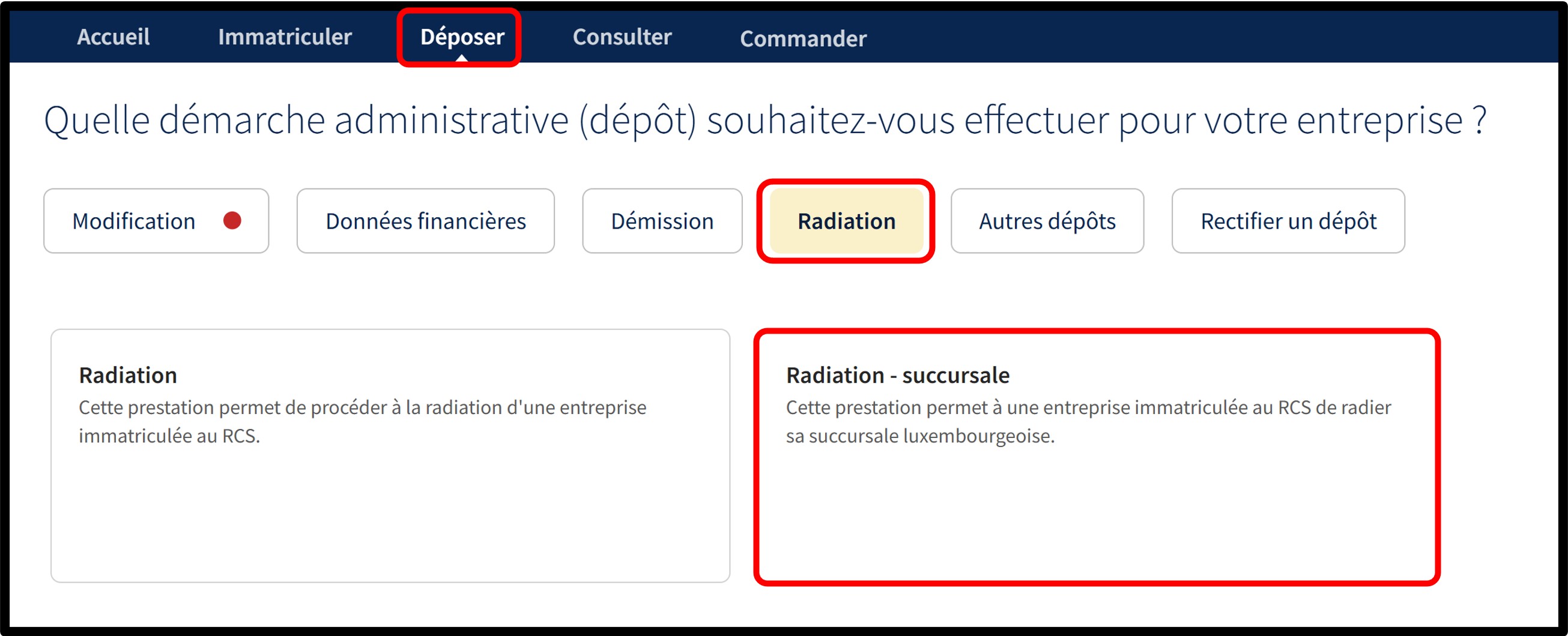 Cette prestation permet d'inscrire au RCS l'arrêt des activités pour la succursale luxembourgeoise d'un commerçant. Cette prestation permet de mettre à jour les informations enregistrées au RCS pour indiquer que votre succursale luxembourgeoise ne poursuit plus son activité. Ce dépôt est obligatoire et doit être fait dès que vous avez pris la décision d’arrêter.