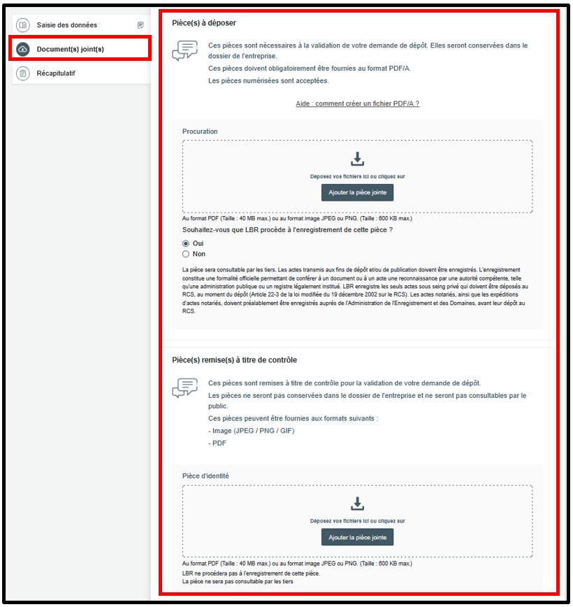 L'utilisateur est également invité à répondre à la question relative à l’enregistrement du document par LBR. Le gestionnaire du RCS est habilité à enregistrer les documents transmis à des fins de validation. L’utilisateur a dès lors le choix d’indiquer lors de sa demande s’il souhaite ou non que LBR procède à l’enregistrement de la pièce en question. Pour ce faire, l’utilisateur est invité à cocher l’une des options disponibles. Si l'utilisateur coche Non, il devra faire enregistrer son document directement auprès de l'AED.
