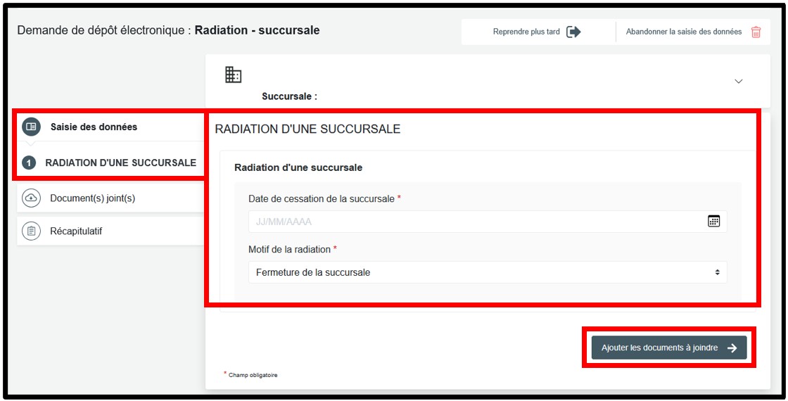 - La date de cessation de la succursale (à noter que celle-ci doit être identique ou postérieure à la date de création de la succursale).
