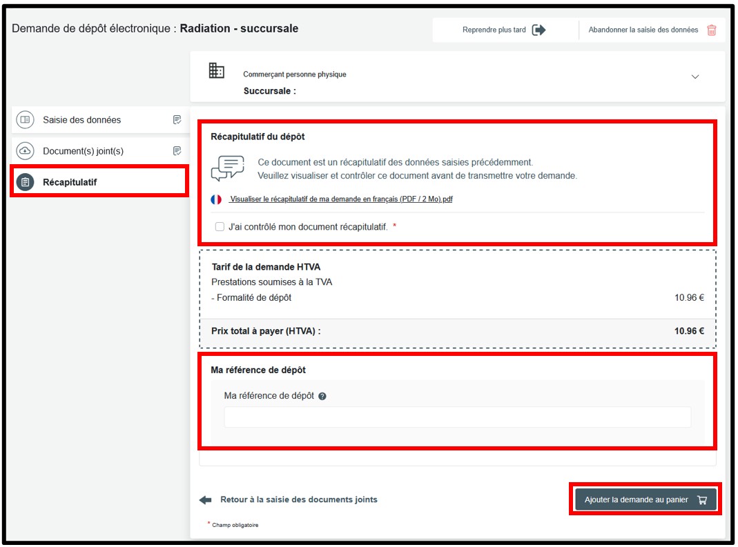 Rubrique de la demande de dépôt de radiation qui reprend le récapitulatif de la demande à des fins de vérification par l’utilisateur avant que celle-ci soit transmise au panier. L’utilisateur est invité à visualiser le récapitulatif de sa demande de démarche administrative au format PDF en cliquant sur le lien Visualiser le récapitulatif de ma demande en français. En cas d’erreur constatée lors de la vérification du document récapitulatif, l’utilisateur peut retourner à la demande en cliquant sur l’étape précédente jusqu’à accéder à la rubrique ou à la sous-rubrique dont les informations sont à corriger.