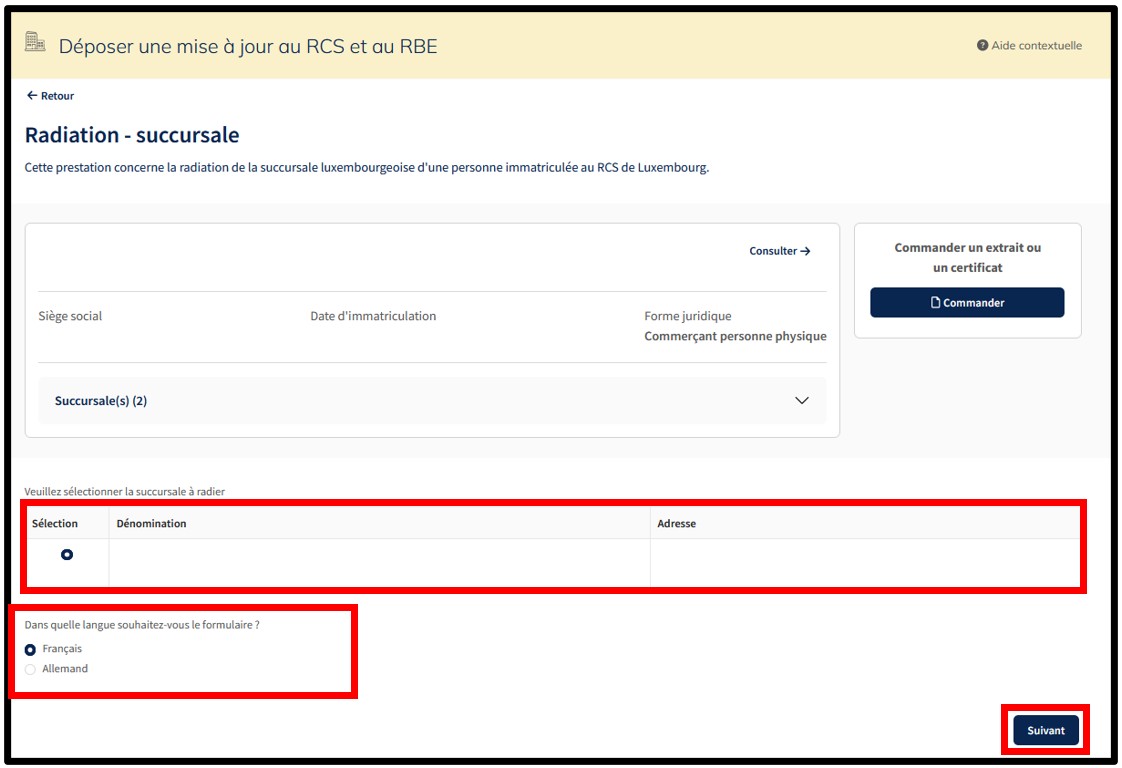- A sélectionner la succursale luxembourgeoise concernée par la radiation.