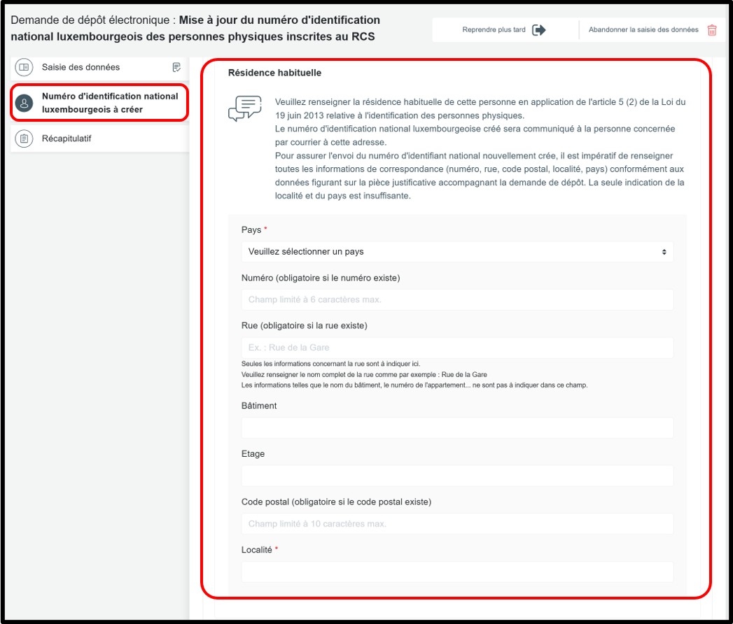 Dans le cadre d’une demande de création d’un numéro d’identification national luxembourgeois, il convient de communiquer l’adresse du domicile privé de la personne dans la rubrique Résidence habituelle. C’est en effet à cette adresse que sera envoyé le numéro d’identification national nouvellement crée.