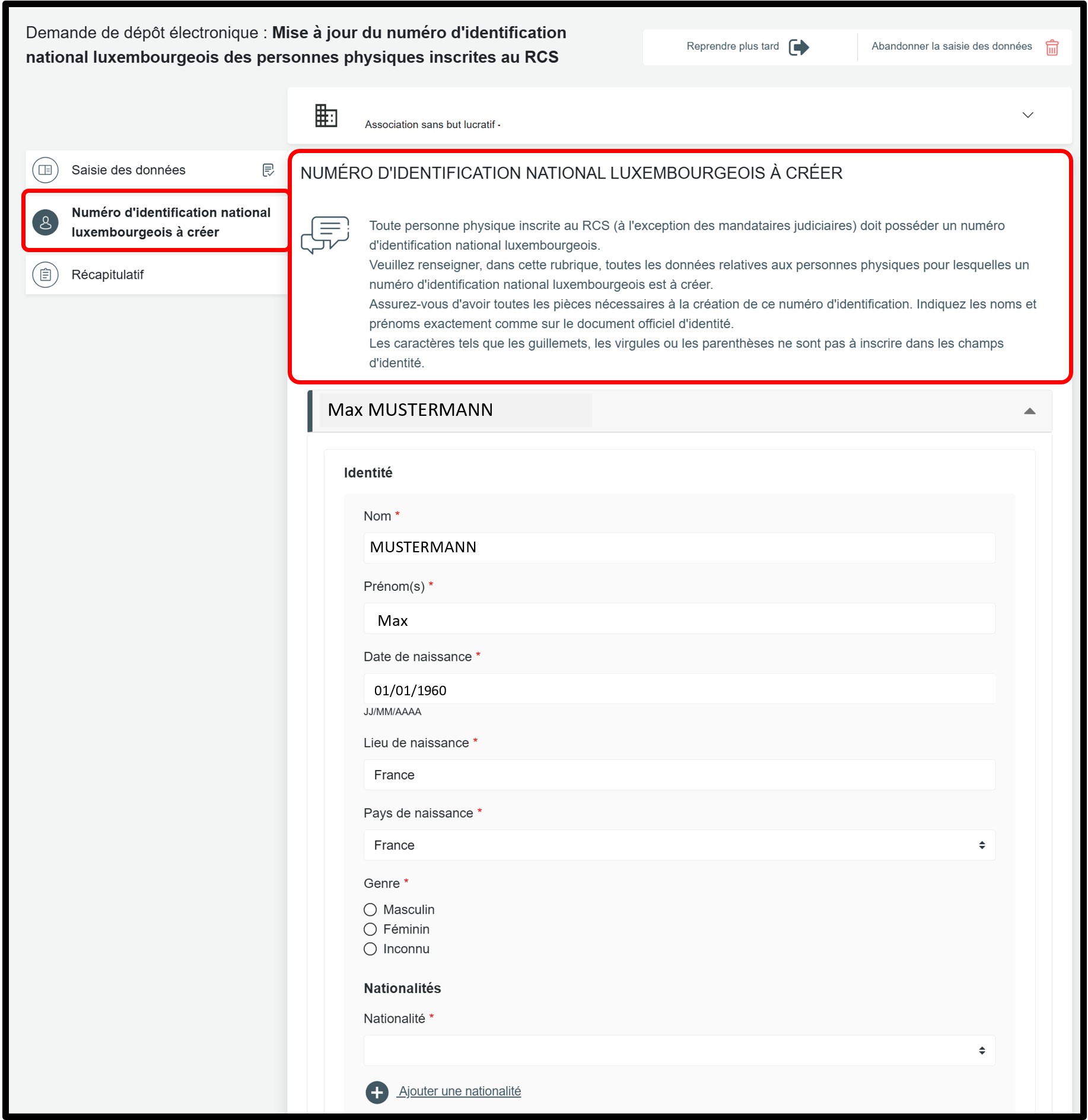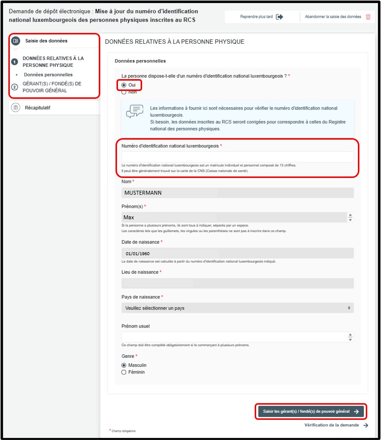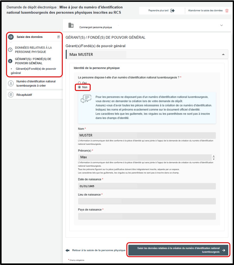 Concernant les personnes physiques à inscrire au RCS, si le commerçant ou, le cas échéant, son gérant et/ou son fondé de pouvoir ne dispose pas d’un numéro d’identification national luxembourgeois, la création de ce dernier doit être demandée dans le cadre de la demande de mise à jour. Pour ce faire, l'utilisateur doit cocher la case Non en réponse à la question posée au sein du formulaire de saisi, puis cliquer sur le bouton Saisir les gérant(s) / fondé(s) de pouvoir général ou Vérification de la demande pour accèder à la rubrique du formulaire de saisie permettant la création du numéro d'identification luxembourgeois.