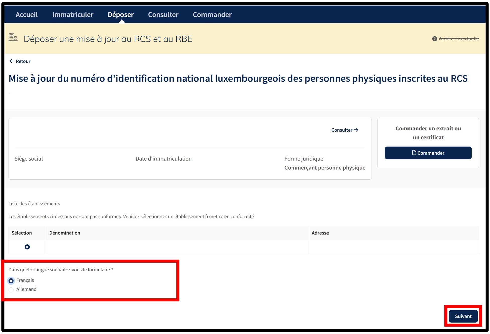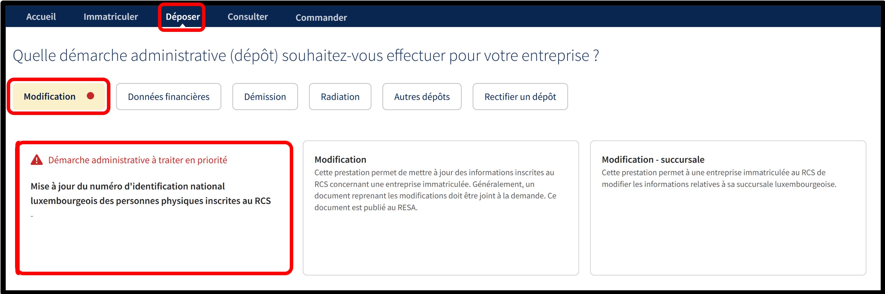Cette prestation permet la mise à jour du numéro d'identification national luxembourgeois du commerçant personne physique immatriculé au RCS, ainsi que le cas échéant, celui de son gérant ou de son fondé de pouvoir général. Ce numéro doit être renseigné pour toute personne physique inscrite ou à inscrire au RCS, au sein du dossier de votre entreprise, à quelque titre que ce soit.