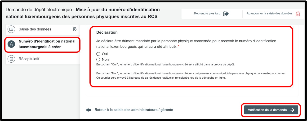- En cochant Oui : le numéro d’identification national luxembourgeois généré sera affiché dans la preuve de dépôt, téléchargeable à l’issue de la démarche.