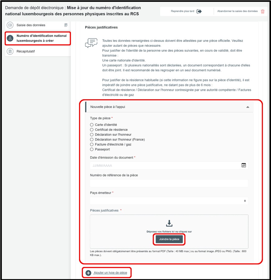 Il devra également joindre une pièce d’identité et, le cas échéant, un justificatif de domicile comme pièces justificatives dans le cadre de la création d’un tel numéro par le gestionnaire du RCS lors de l’acceptation du dépôt de mise à jour. Il est important que les informations saisies au sein de la demande correspondent aux informations figurant sur la ou les pièce(s) justificative(s) qui sera (seront) à joindre à l’appui de la demande de création du numéro d’identification national luxembourgeois.