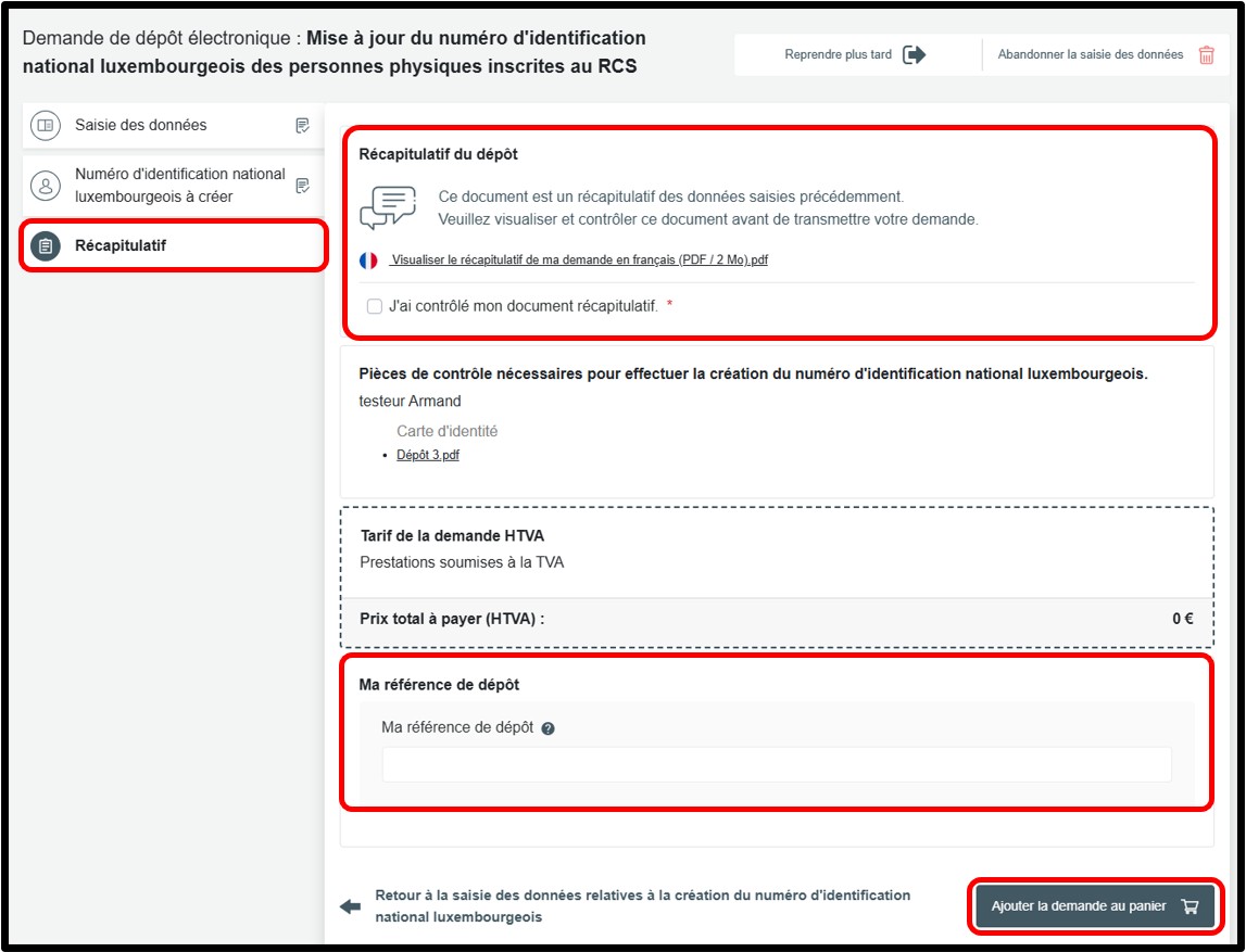 Si lors de cette étape de vérification du document récapitulatif, l’utilisateur constate que les informations saisies sont correctes, il doit obligatoirement cocher la case J’ai contrôlé mon document récapitulatif. L’utilisateur peut également indiquer une référence de dépôt dans le champ Ma référence de dépôt, définie librement, pour mieux organiser ses demandes.