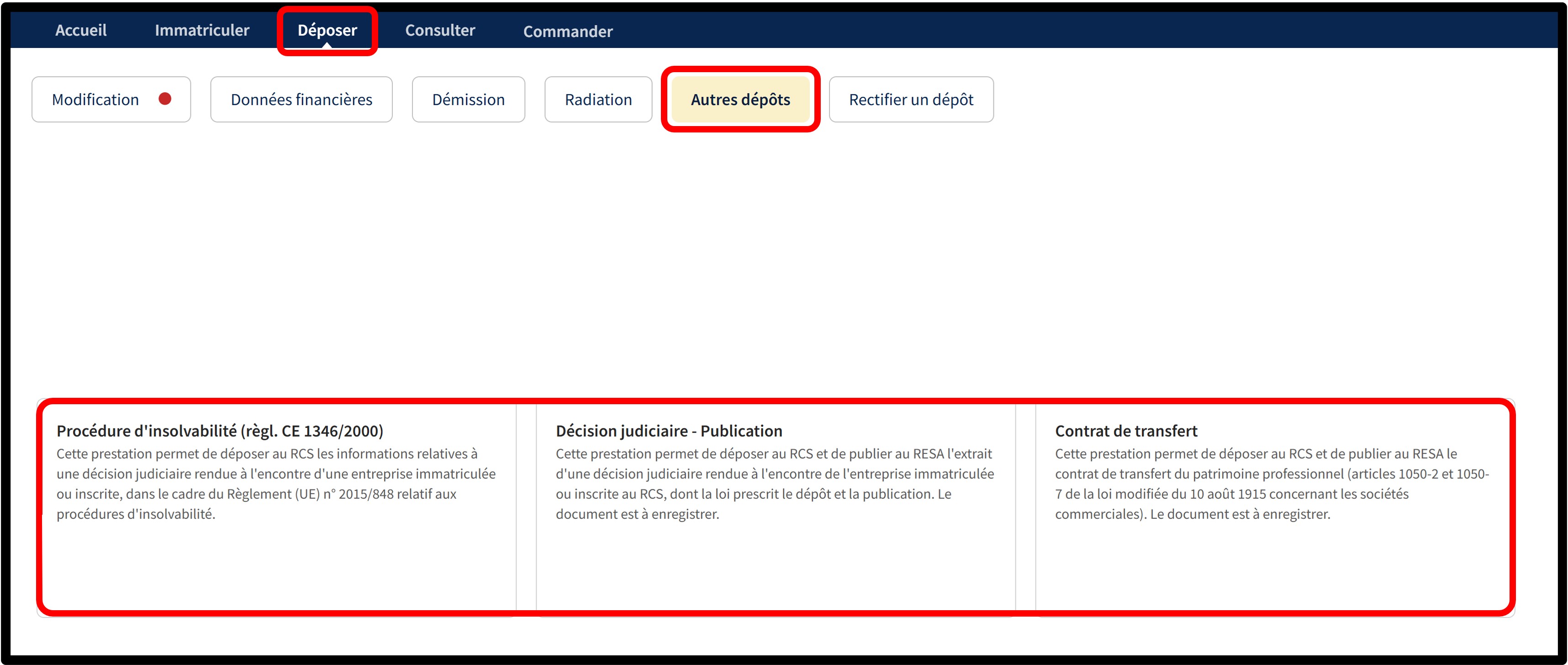 Au sein de la catégorie Autres dépôts, le commerçant accède à différentes prestations lui permettant d’inscrire au RCS les informations devant être rendues publiques :