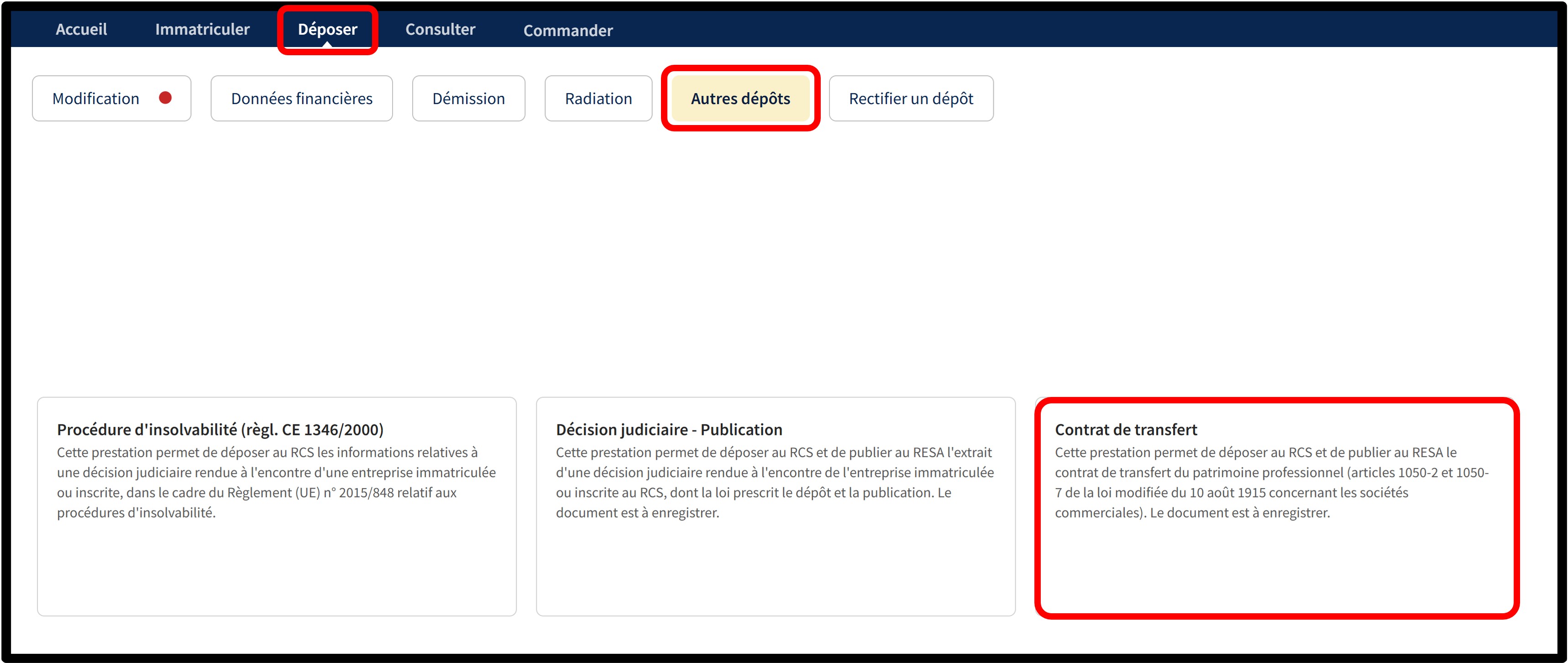 Cette prestation permet de déposer au RCS le contrat de transfert du patrimoine professionnel (Articles 1050-2 et 1050-7 de la loi modifiée du 10 août 1915 concernant les sociétés commerciales). Le document est à enregistrer et est soumis à publication au RESA.