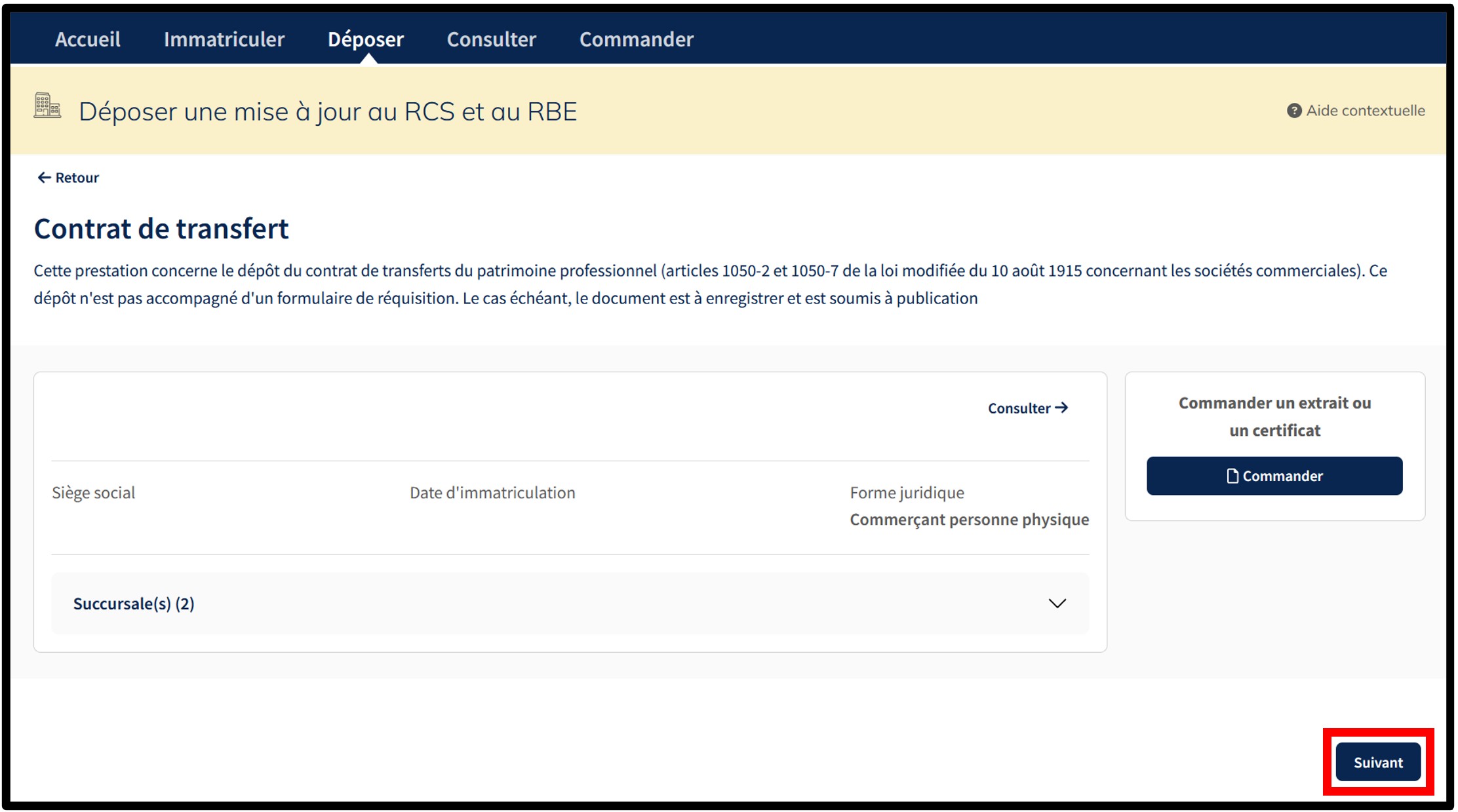 Après avoir sélectionné la prestation Contrat de transfert pour le commerçant concerné, l'utilisateur doit valider la création de sa demande de dépôt en cliquant sur le bouton Suivant. L'utilisateur est ensuite redirigé vers le formulaire correspondant à la démarche choisie.