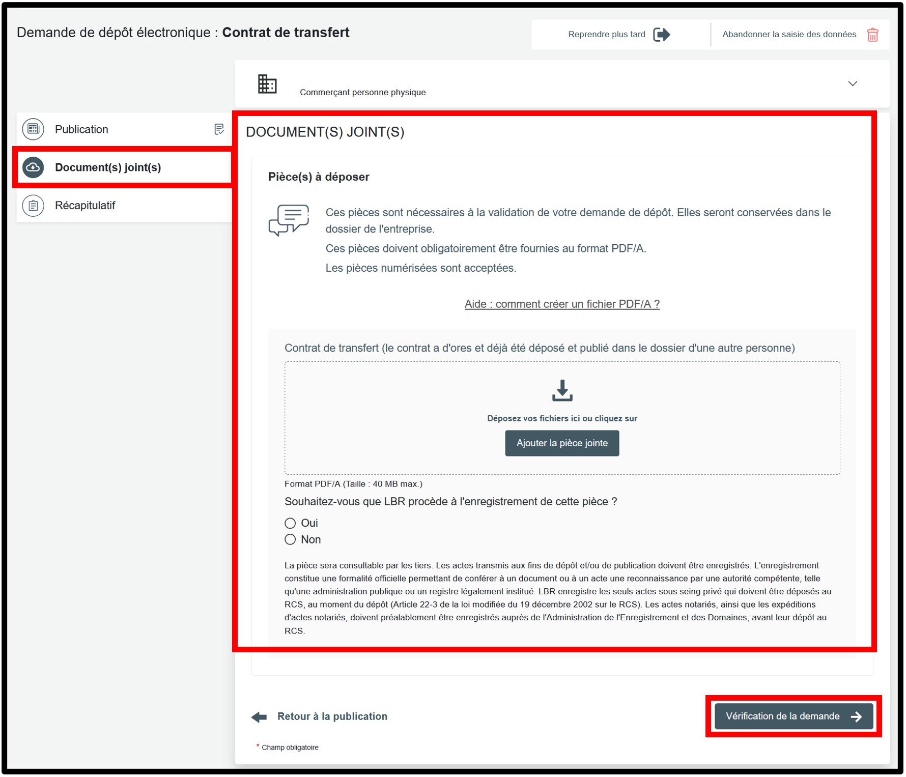 L'utilisateur est également invité à répondre à la question relative à l’enregistrement du document par LBR. Le gestionnaire du RCS est habilité à enregistrer les documents transmis à des fins de validation. L’utilisateur a dès lors le choix d’indiquer lors de sa demande s’il souhaite ou non que LBR procède à l’enregistrement de la pièce en question. Pour ce faire, l’utilisateur est invité à cocher l’une des options disponibles. Si l'utilisateur coche Non, il devra faire enregistrer son document directement auprès de l'AED.