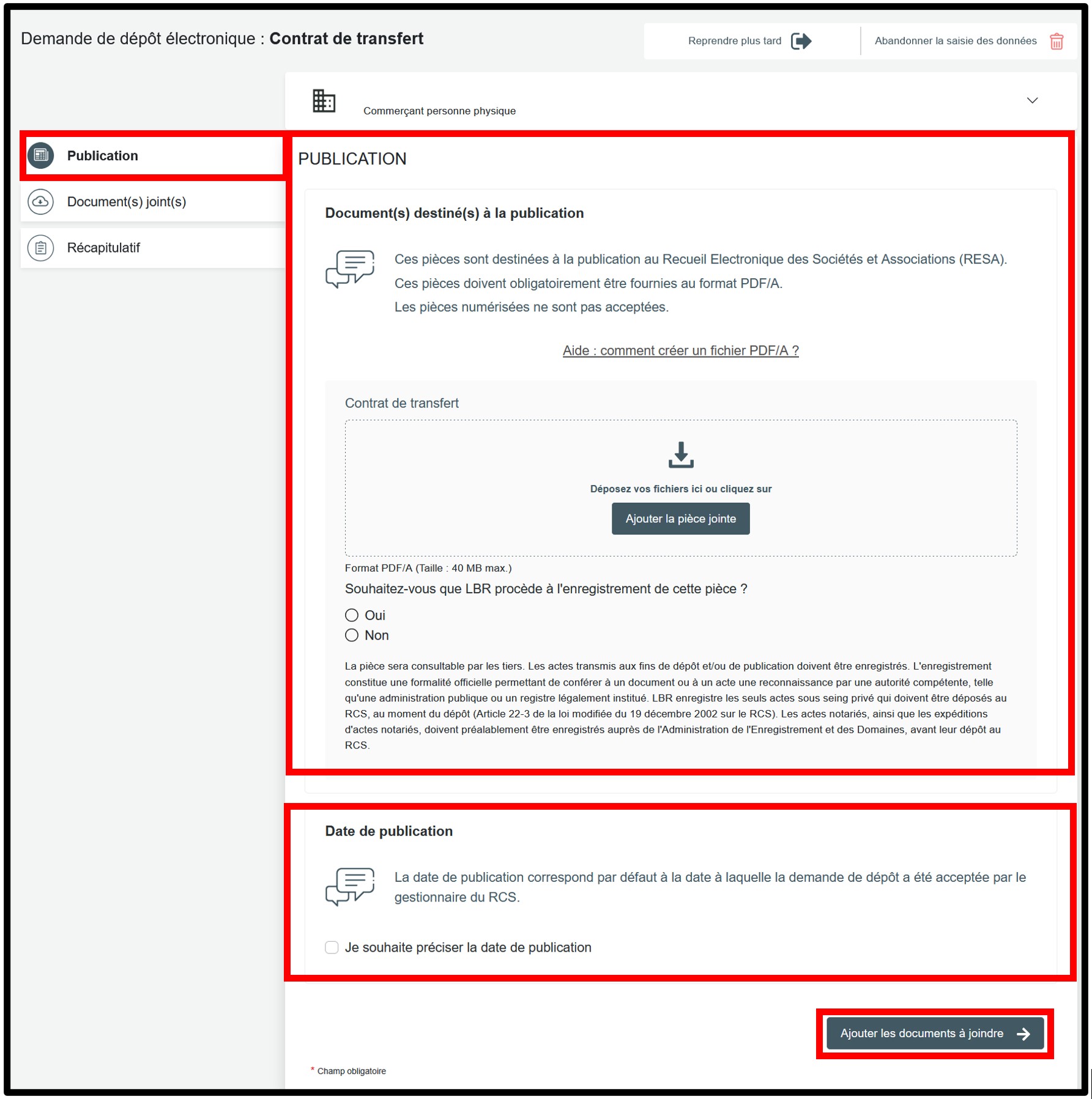 Dans le formulaire, au sein de la rubrique Publication, l’utilisateur est invité à télécharger le contrat de transfert qui sera publiée au RESA. Le document à joindre doit être un fichier PDF respectant la norme PDF/A texte. C'est dans cette rubrique que l'utilisateur doit télécharger :