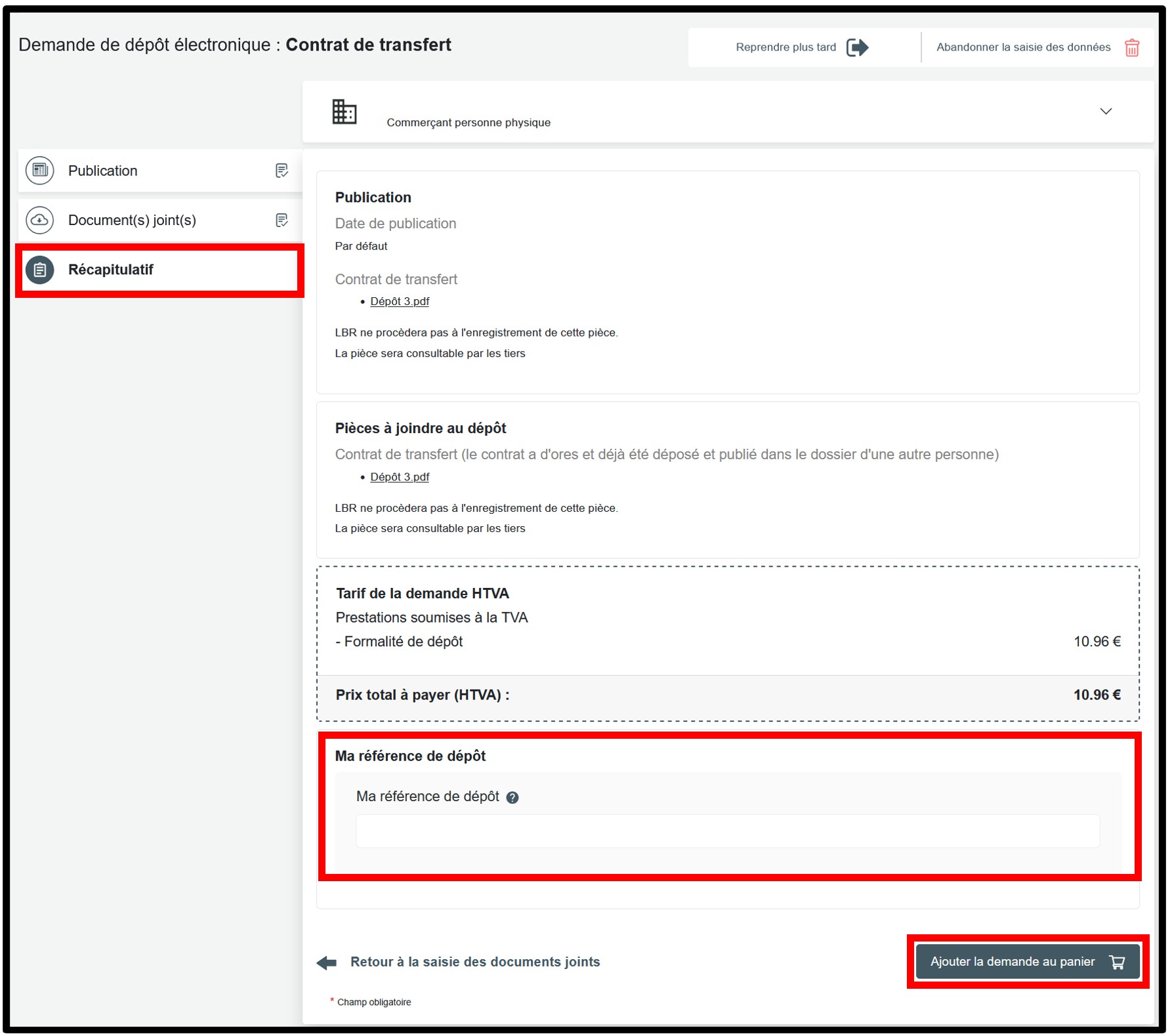 La rubrique Récapitulatif reprend le récapitulatif de la demande à des fins de vérification par l’utilisateur avant que celle-ci soit transmise au panier. L’utilisateur peut également indiquer une référence de dépôt dans le champ Ma référence de dépôt, définie librement, pour mieux organiser ses demandes. L'utilisateur valide ensuite sa demande de démarche administrative en cliquant sur le bouton Ajouter la demande au panier.