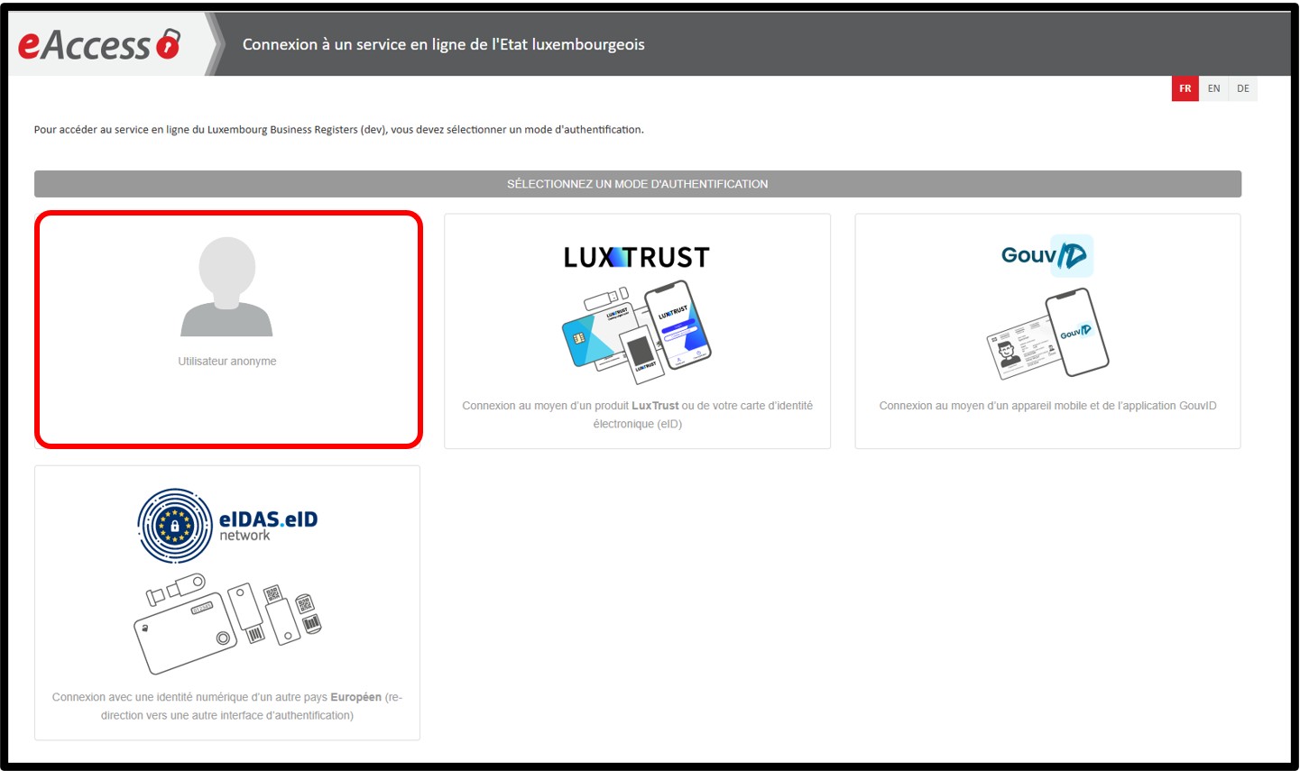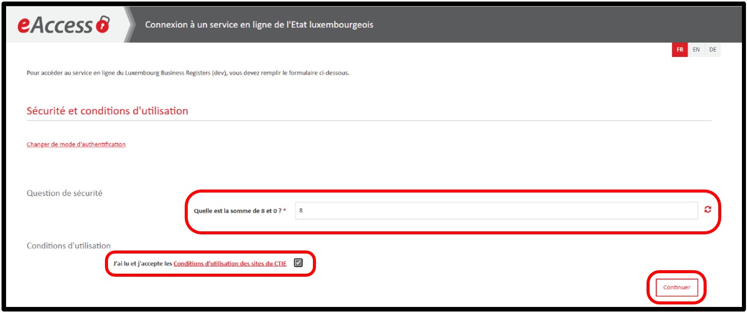 Après avoir sélectionner le mode d’authentification par Connexion anonyme (Utilisateur anonyme), l’utilisateur est invité à répondre à une question de sécurité, prouvant qu’il ne s’agit pas d’un robot, et d’accepter les conditions d’utilisation des sites du CTIE en cochant la case correspondante.