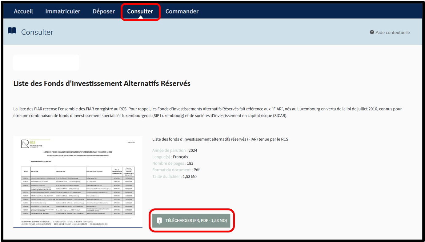 En sélectionnant la consultation de la liste des FIAR, l’utilisateur accède à l’écran permettant le téléchargement de la liste des FIAR tenue par le RCS.