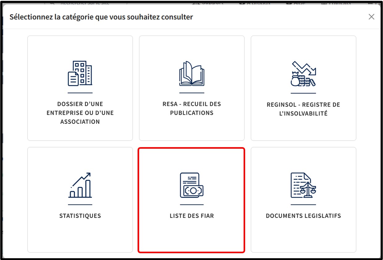 Au sein du pop-up présentant les catégories de consultation, l'utilisateur est invité à cliquer sur la tuile Liste des FIAR qui permet à l’utilisateur d’accéder à la consultation de la liste des fonds d’investissements alternatifs réservés (FIAR) tenue par le RCS.