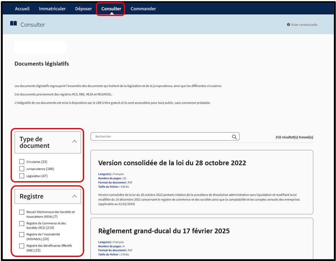 En sélectionnant la consultation des documents législatifs, l’utilisateur accède à l’écran lui permettant de faire une recherche parmi la liste des documents législatifs disponibles.