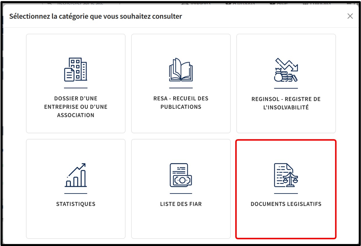 Au sein du pop-up présentant les catégories de consultation, l'utilisateur est invité à cliquer sur la tuile Documents législatifs pour accéder à la consultation :