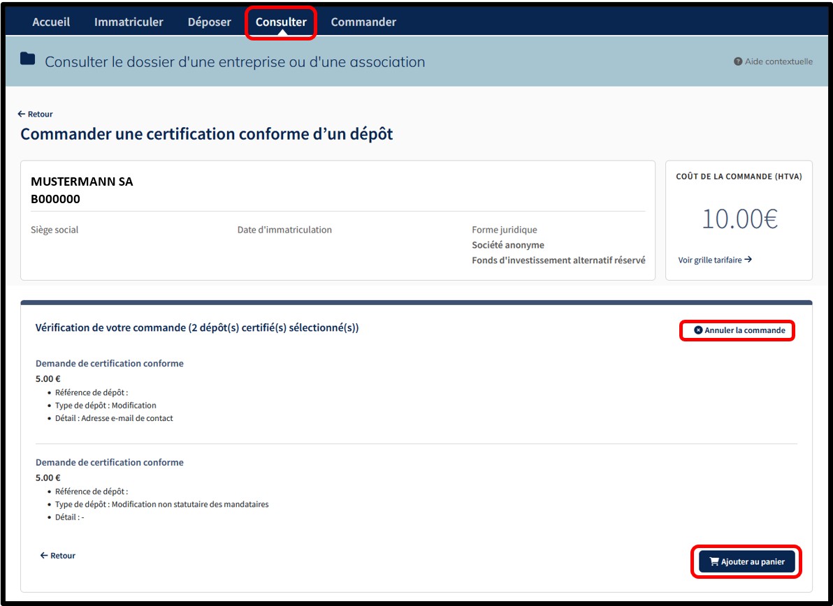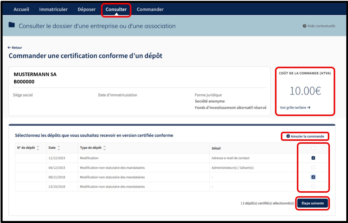 Pour commander les versions certifiées conformes, l’utilisateur doit indiquer son choix en sélectionnant les cases à cocher. Une fois sa sélection faite, l’utilisateur doit cliquer sur le bouton Étape suivante. A l’Étape suivante, l’utilisateur est redirigé vers l’écran de vérification de la commande résumant la liste des dépôts certifiés sélectionnés par l’utilisateur. L’utilisateur finalise sa commande en cliquant sur le bouton Ajouter au panier.