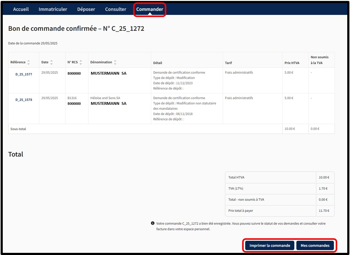La prestation Demander une certification conforme de l’un des documents de la liste consiste en l’attestation officielle par le gestionnaire du RCS que le dépôt sélectionné par l’utilisateur est une reproduction fidèle et exacte de l’original, en assurant sa validité juridique. Ce service sécurisé, accessible aussi bien par une authentification par connexion anonyme que par une authentification par certificat, permet à l’utilisateur de commander la certification conforme d’un dépôt auprès du RCS.