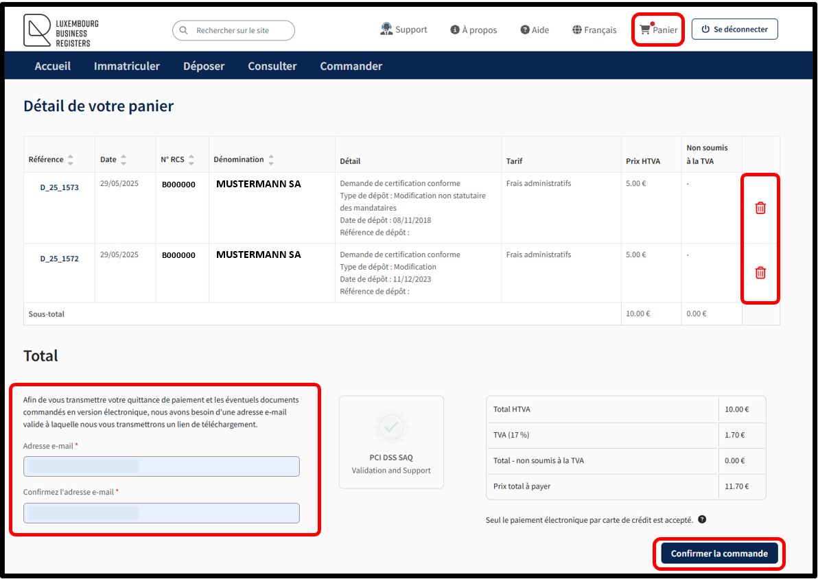 Afin de valider sa commande, l’utilisateur doit cliquer sur le bouton Confirmer la commande. Par cette action, l’utilisateur marque la volonté de procéder au paiement de toutes les demandes du panier. L’ensemble des demandes constitue une commande. Le paiement est réalisé à travers la plateforme sécurisée de paiement électronique Saferpay de SIX Card Solutions.