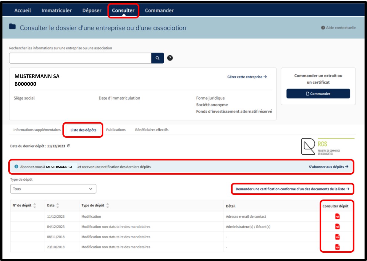 3. Télécharger en fonction du type de dépôt, la demande de dépôt telle qu’elle a été déposée au RCS, au format PDF, en cliquant sur l’icône PDF.