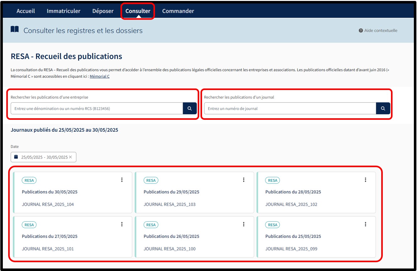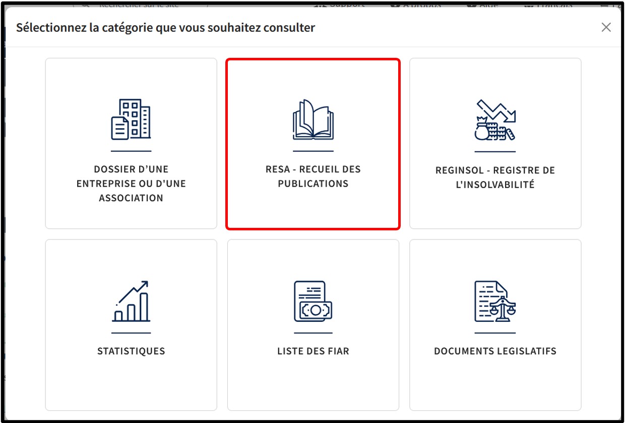 Au sein du pop-up présentant les catégories de consultation, l'utilisateur est invité à cliquer sur la tuile RESA - Recueil des publications afin de lui permettre d’accéder à la consultation de l'ensemble des publications légales officielles, auxquelles sont soumises légalement les sociétés et associations.