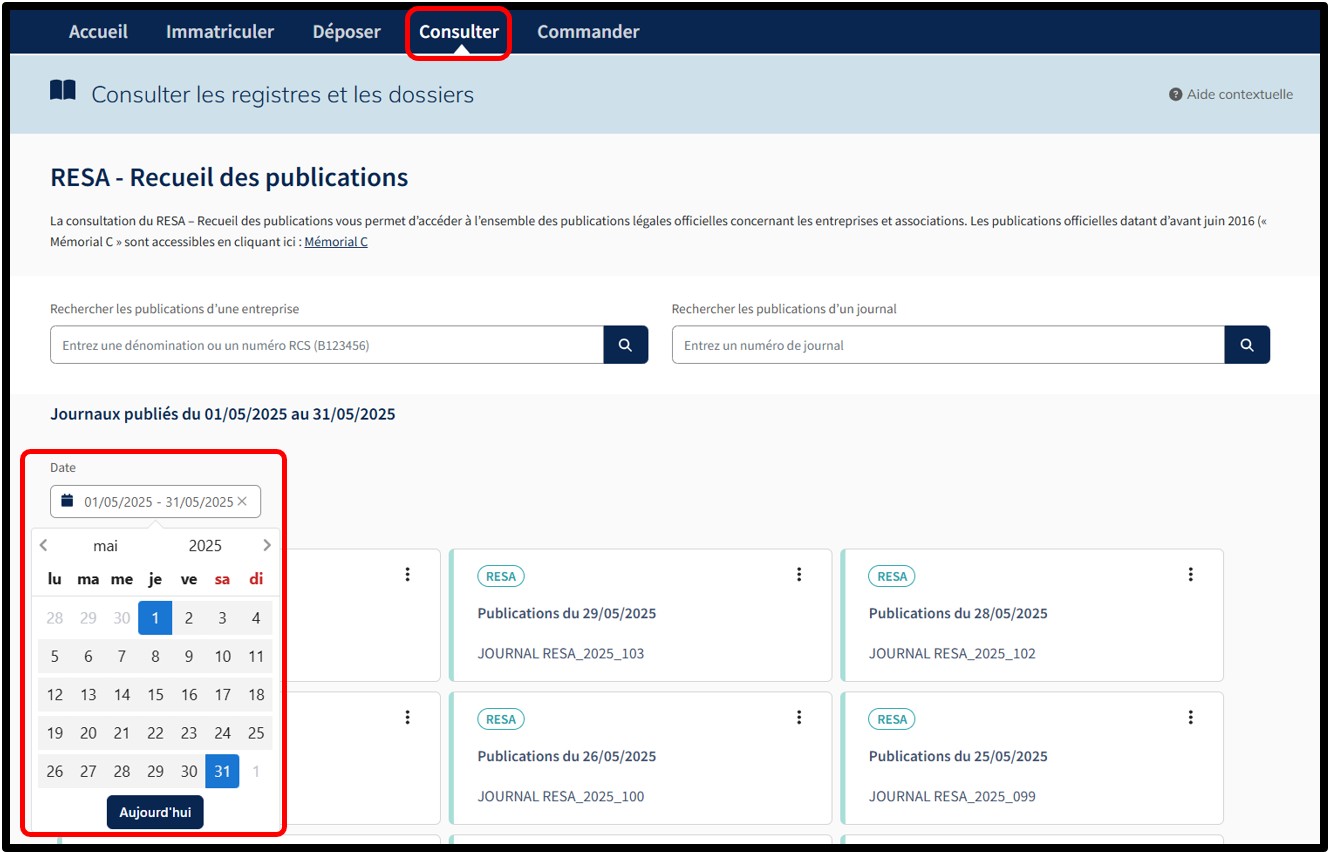Pour cela, il lui est possible de renseigner, dans le champ dédié Date, une date ou une période spécifique pour afficher les publications au RESA correspondant à la période renseignée.